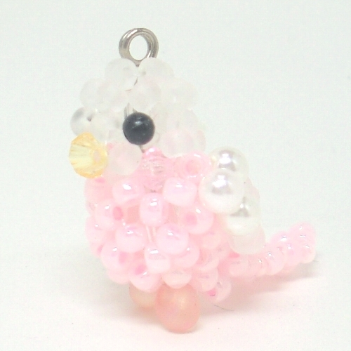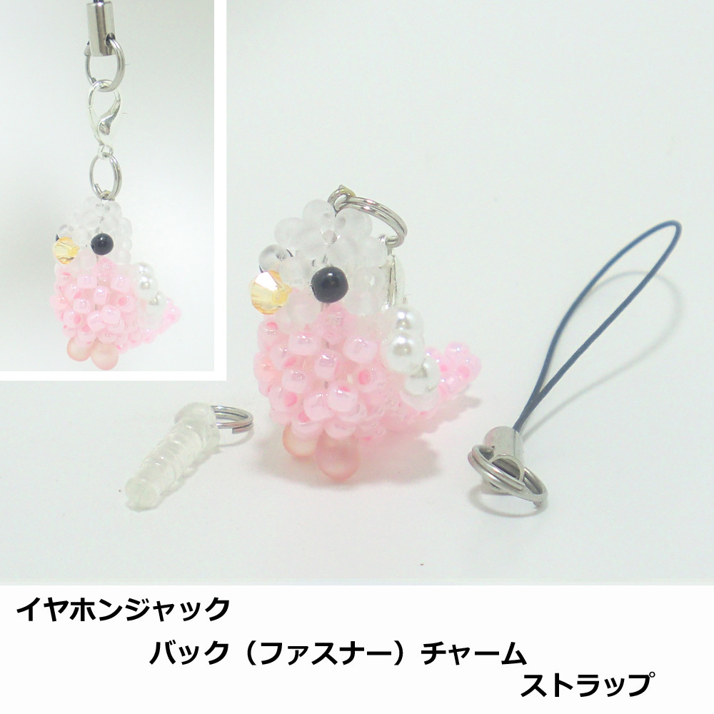 セキセイインコ パステルピンク ビーズの小鳥★3WAY(ストラップ・イヤホンジャック・ファスナーチャーム)工房小鳥屋さん