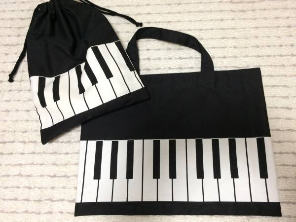 ハンドメイドのピアノ鍵盤柄レッスンバッグ&巾着です。
