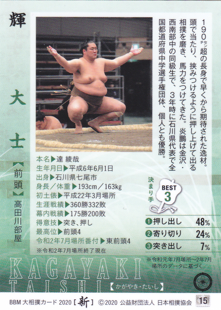 BBM大相撲カード2020[新] 15 輝 高田川部屋 石川県七尾市 西南部中学校