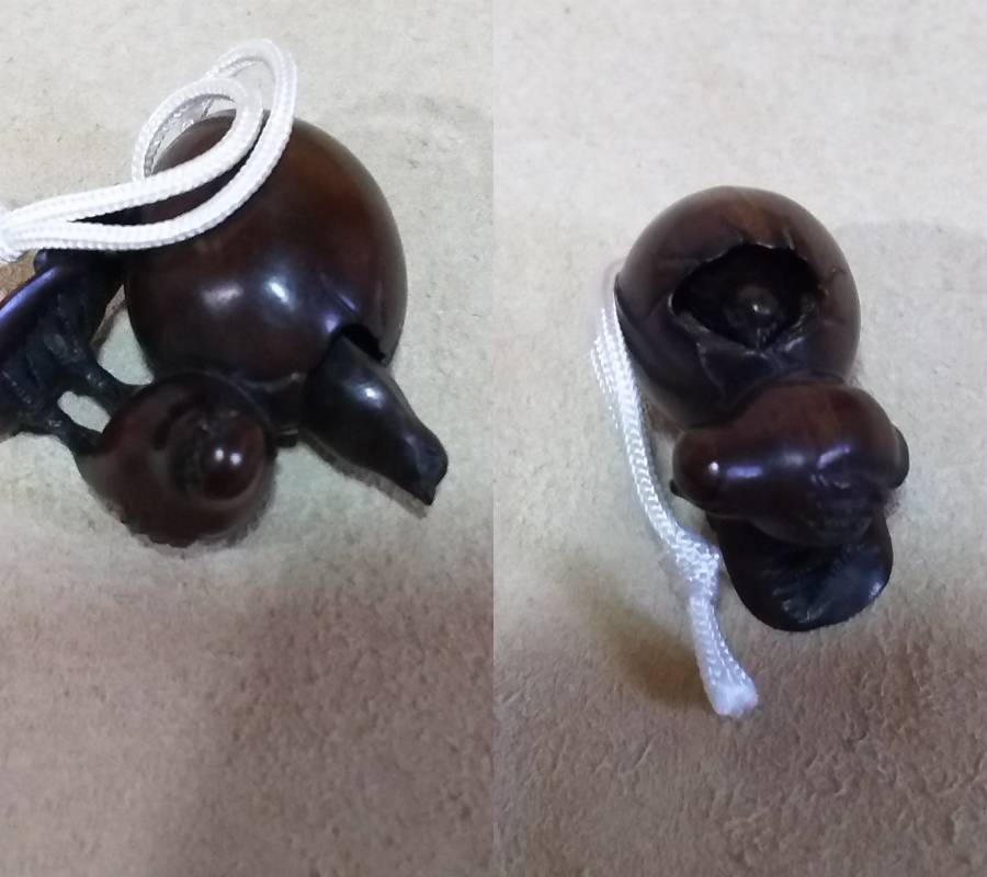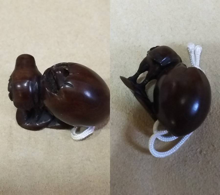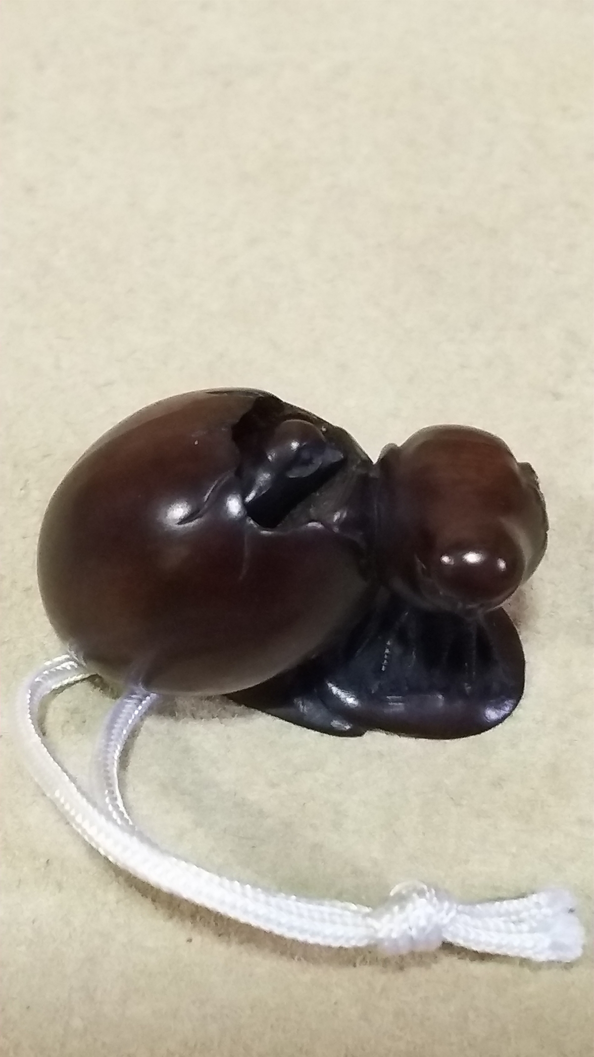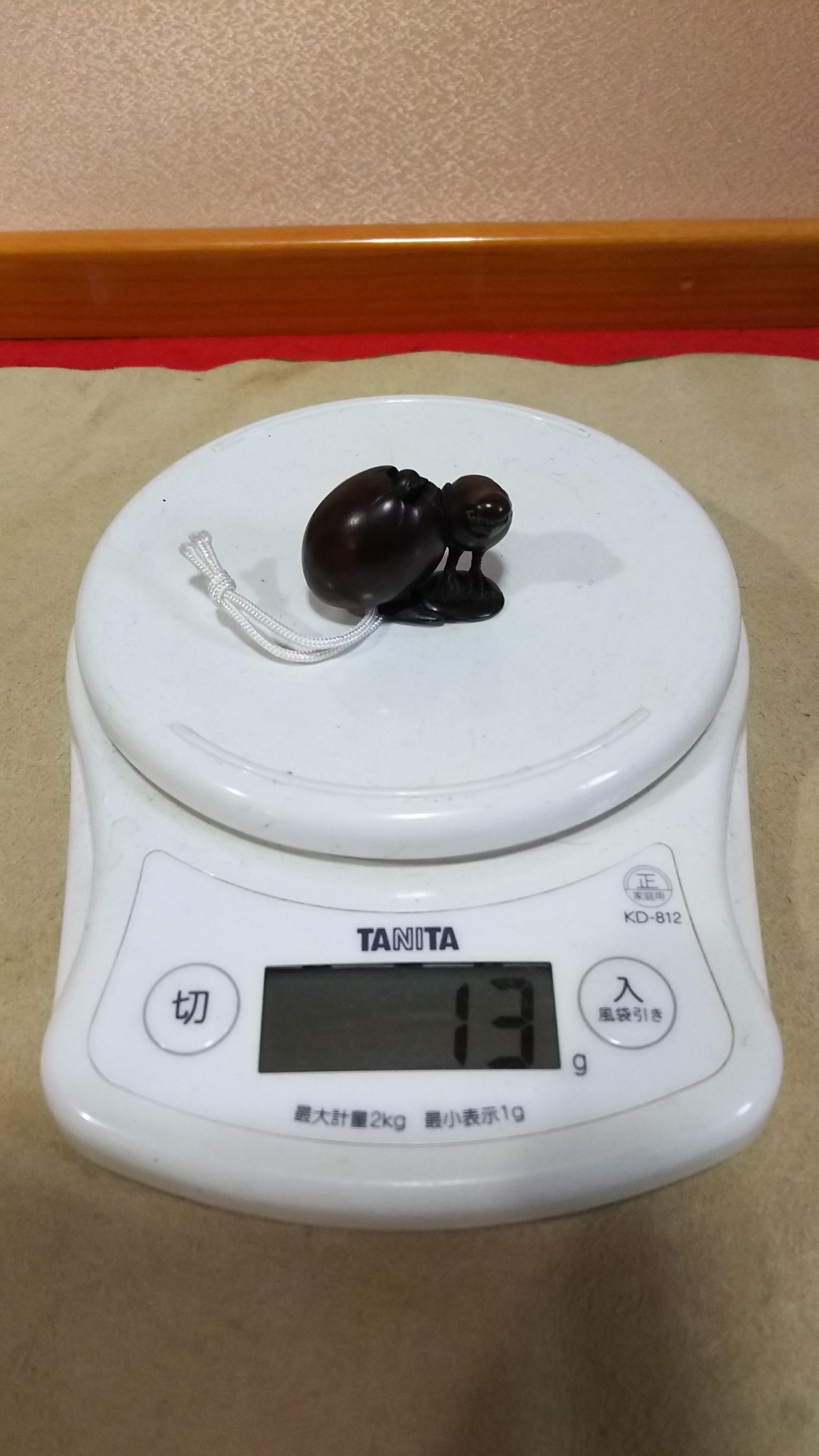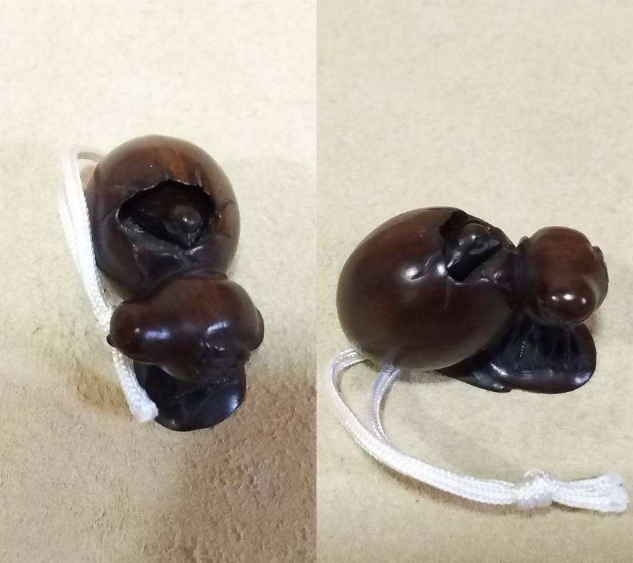 (鳥羽庵)うぶだし品根付コレクター放出品 黒檀 木製名工吉昭からくり根付鳥卵に雛鳥カラクリ サイズ横幅3,9センチ 高さ2,7センチ 奥行幅2,1センチ 重量13グラム 商品状態説明 在銘吉昭作木製(縞黒檀)カラクリ根付鳥と卵の殻から雛鳥出たり入ったりする細工根付です状態もとても良い極上品です。 詳しくは、写真参照でお願いします。 下にフォトアップ写真ついてますので参照お願いします。 コレクター放出品 理解うえ入札お願いします。 発送は、ゆうパック60サイズにて発送いたします。 落札後48時間4日以内で入金できる方のみ入札お願いします。