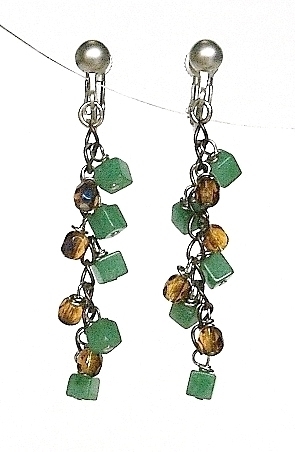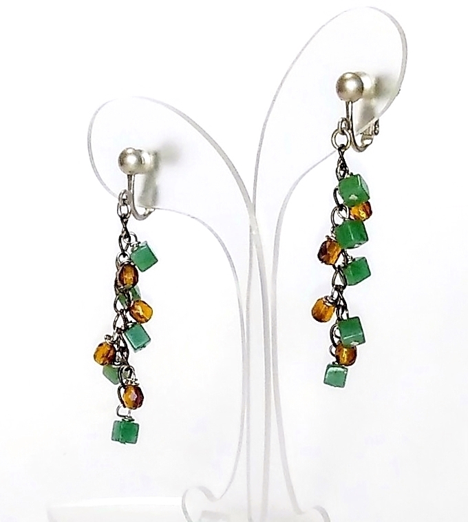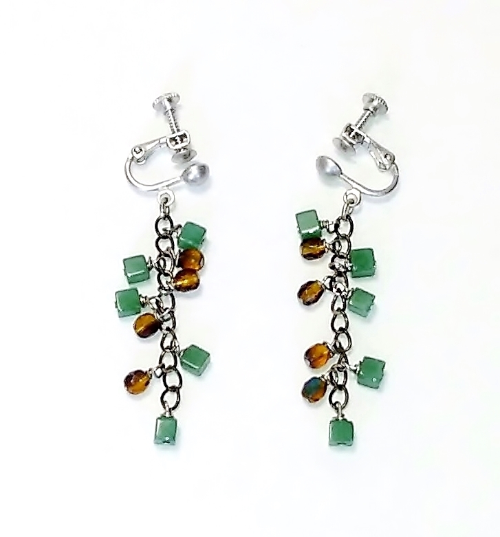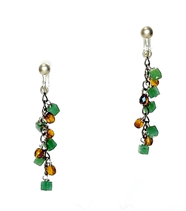 フック式ピアスに変更することも出来ます。 ご注文の際にお申し付け下さい。 ハンドメイド(手作り)の1点物です。 落ちついたグリーン系のアベチュリンと茶系のオーロラビーズの配色がお洒落なイヤリング。 チェーンに1コ1コていねいに取り付けました。 耳元でソフトに心地よく揺れます。 スタイルを問わず、幅広い年令層にお使いになれます。 問屋を通さず、メーカー直結ならではのプライスでご提供いたします。 絶好のチャンスをお見逃しなく!! 是非おすすめします。 素 材:アベンチュリン角型・チェコビーズ イヤリング台・ネジバネ式シルバーマット調 サイズ:アベンチュリン・4m/m チェコビーズ・5×4mm 丸カンからの下がり・約40mm er-169 市場価格の5割引でご奉仕いたします。 | |||