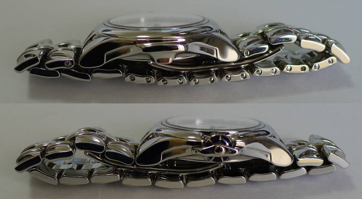 リューズ部分のデザインが特徴的ですが、スポーツモデルのような捻じ込み式ではありません。