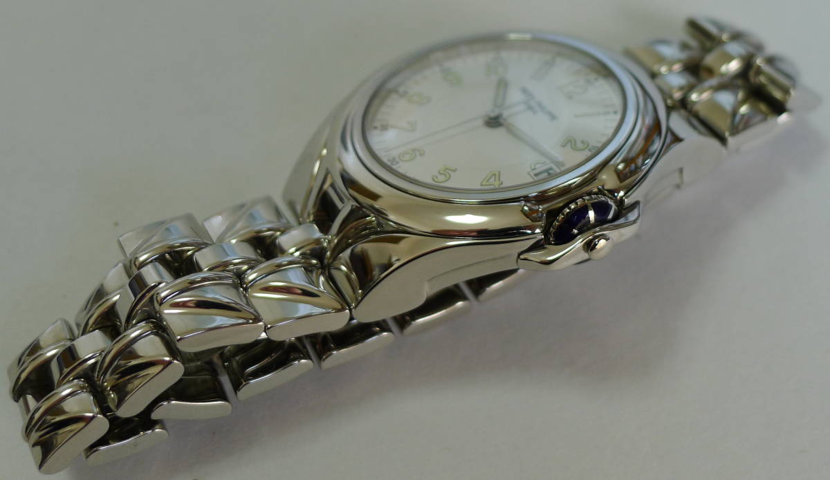 ステンレススチールのケース&ブレス、ホワイト文字盤、アラビア数字インデックス、デイト表示付のモデルです。