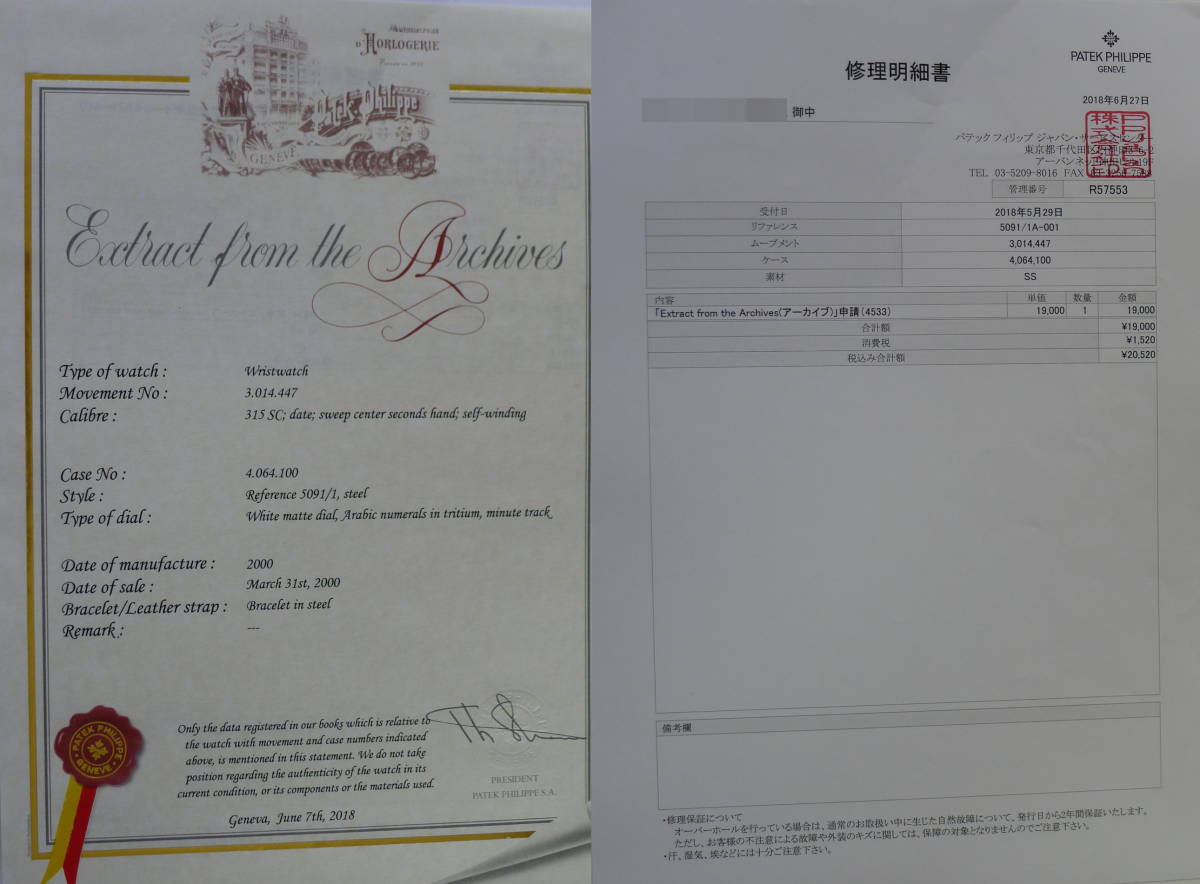 付属品はパテックから返却された際の紙製ケース、アーカイブ、パテックの修理明細書です。