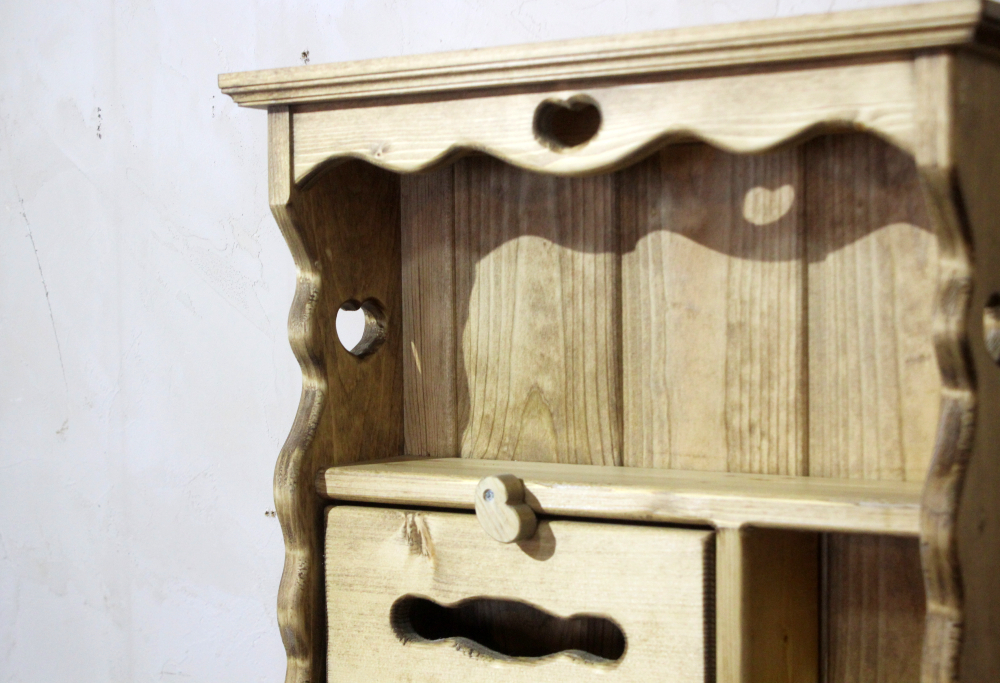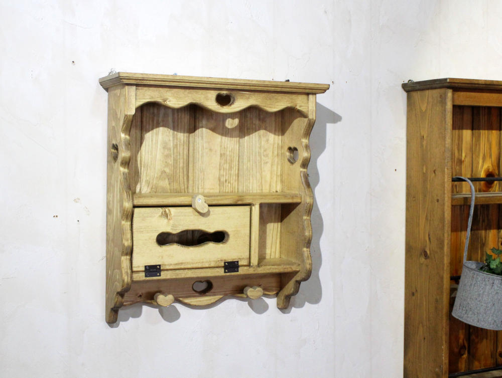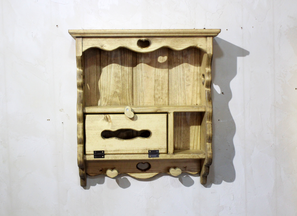 サイズ幅44奥14高さ48センチ <BR>ティッシュボックスつきの壁掛けシェルフです。<BR>背面には金具をつけていますので、ビスや釘やLカン等で壁掛けにできます。<BR><BR>こちらのお品は落札後の製作になりますので、製作にお時間を少し頂くことになります。(約2週間程度)全て手作りで製作しており、丁寧に製作しているつもりですが、<BR>無垢の板使用で、差し支えのない反りや割れ、製作時に生じた細かな傷や隙間等あるかもしれません。<BR>手作り品をご理解のうえ、ご入札宜しくお願い致します。画像は参考画像ですので木目等、多少画像と異なる場合がございます。