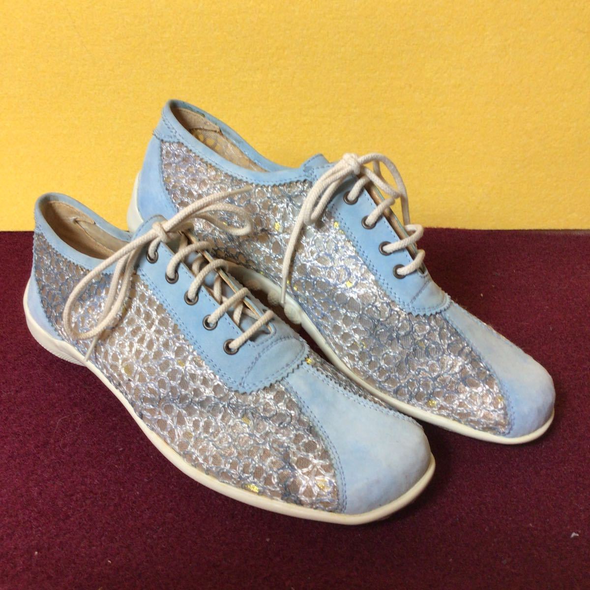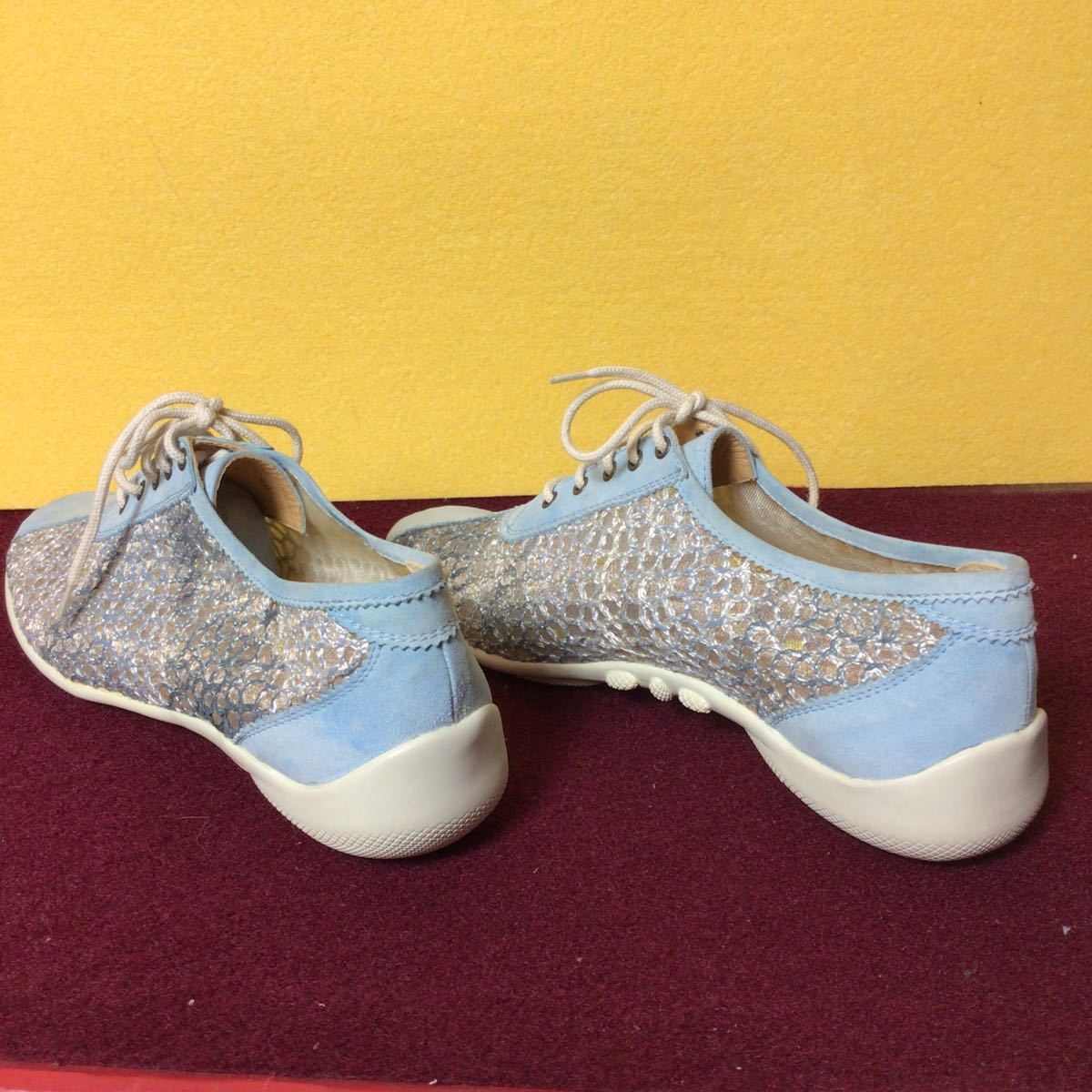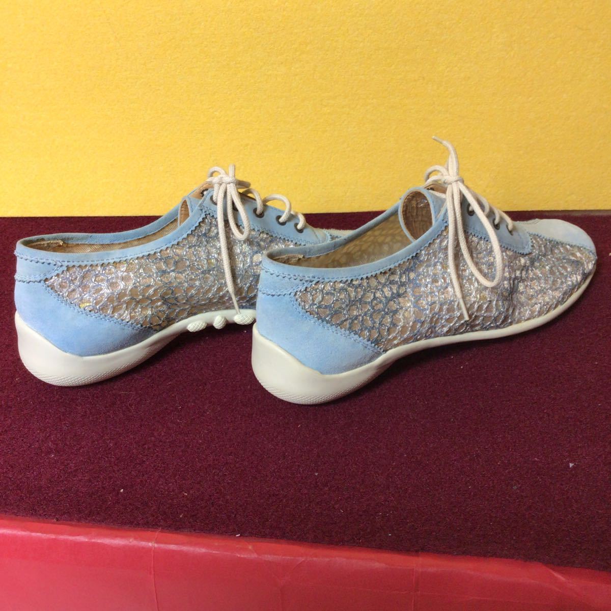シースルーと淡いブルーのウエードがとても爽やかなスニーカーとなります。春夏の足元をとても涼しげしてくれそうです。女性的なデザインなのでふんわりしたスカートなどにとてもよく合うかと思います。
