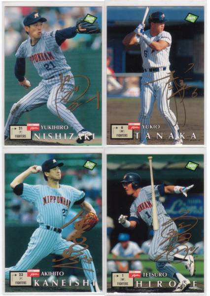 BBM95のゴールドサイン入りカード#256西崎幸広、#258武田一浩、#259金石昭人、#261河野博文、#263芝草宇宙、#273田村藤夫、#492広瀬哲朗、#493白井一幸、#494田中幸雄、#500中島輝士のBBM95日本ハムのゴールドサイン入りカードチームコンプリートセット全10枚です。