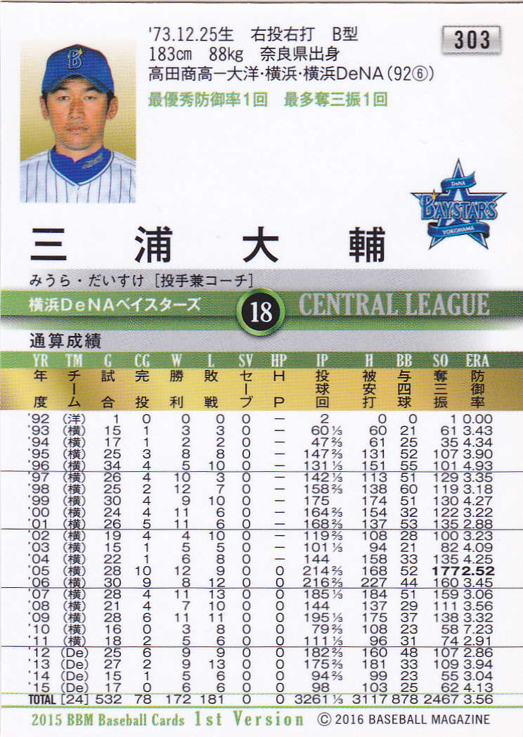 BBM2016ベースボールカード1st 303 三浦大輔 奈良県 高田商業高校 大洋 横浜DeNAベイスターズ エラーカード