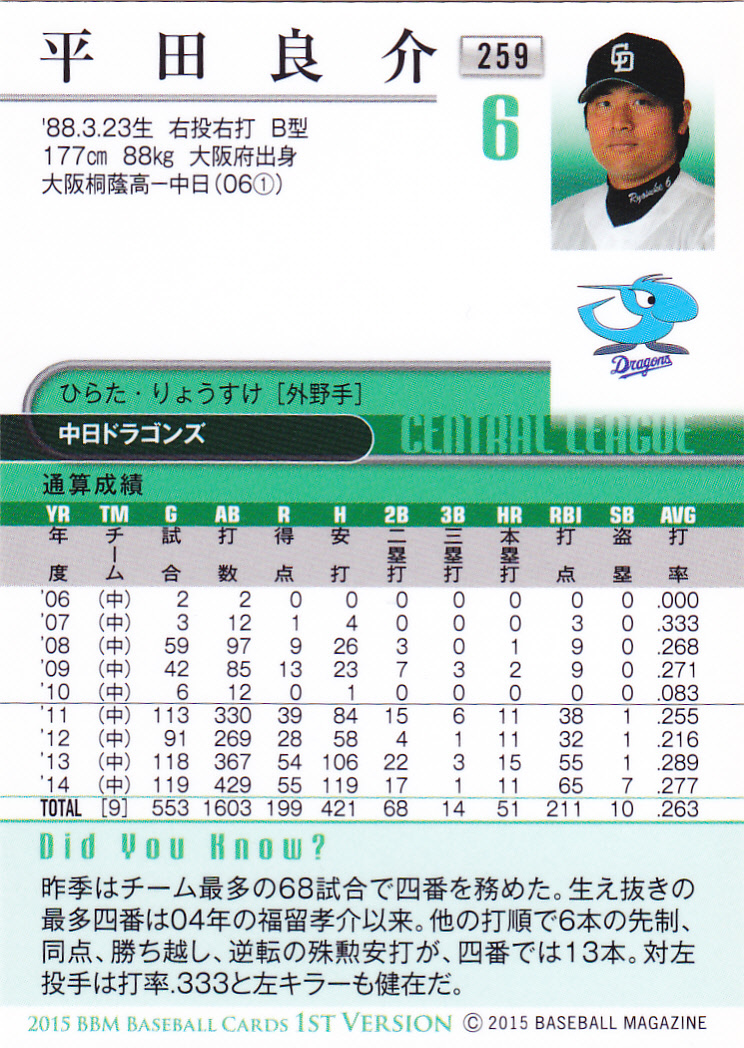 BBM2015ベースボールカード1st 259 平田良介 大阪府 大阪桐蔭高校 ドラフト1位 中日ドラゴンズ