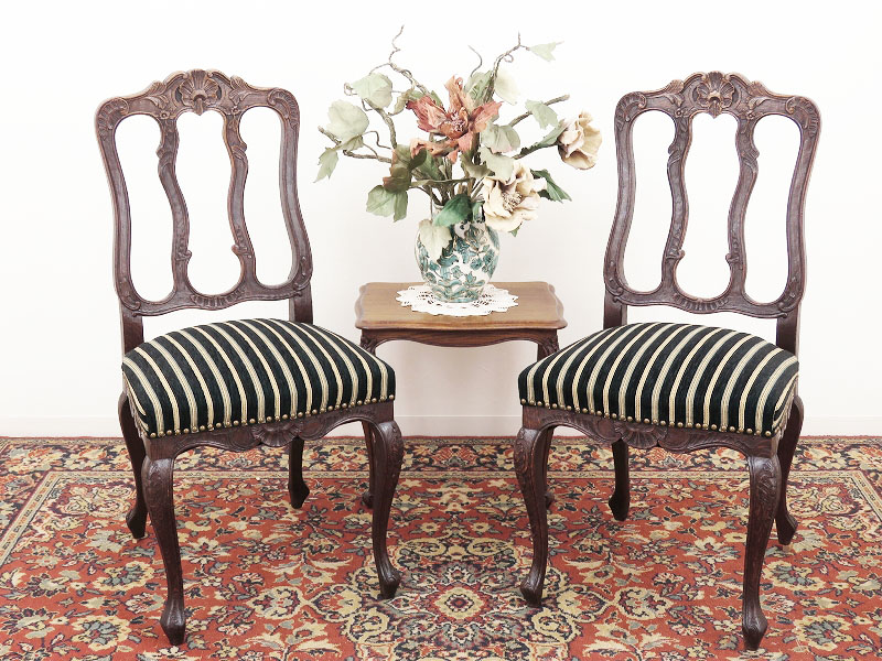 彫刻が美しいフランスのネコ脚チェアの2脚セットです。脚や背もたれのトップ・座面の下などに施された彫刻が華やかで上品な印象の商品です。後ろ脚もしっかりとカーブした猫脚に仕上げられ、クオリティーの高さがうかがえます。