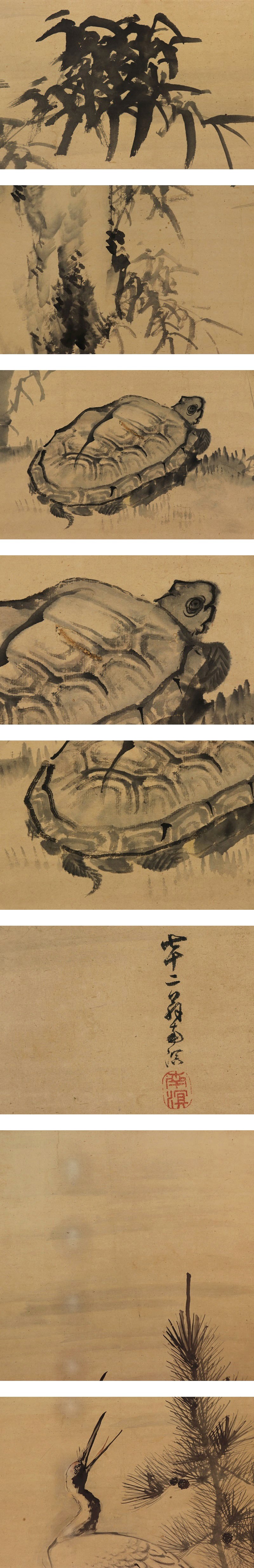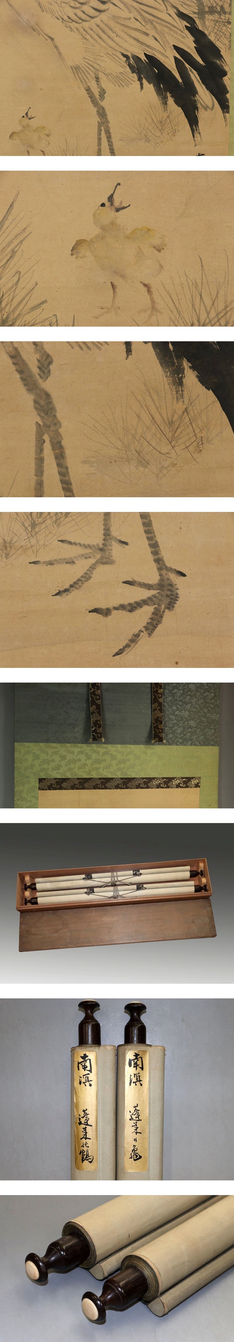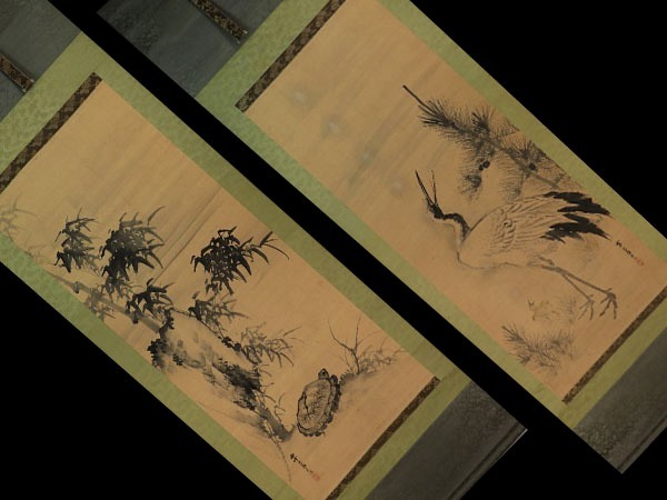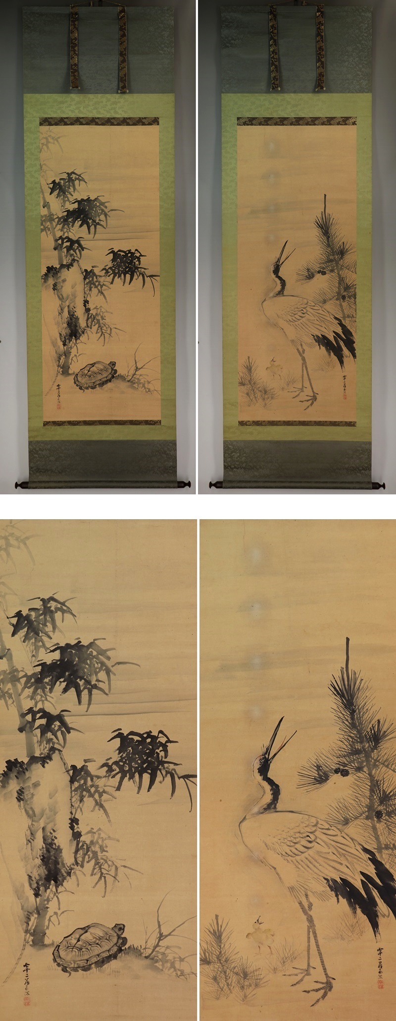 | №2102060【真作】春木南溟【双幅・鶴亀慶祝図】◆紙本◆合箱◆掛軸 | |