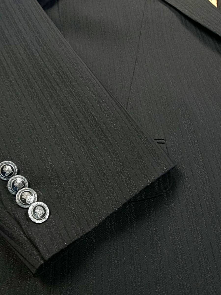 特徴                 黒地に光沢ある黒でのストライプ柄ジャガード織りの生地で、少しゆったり目のシルエットが着心地良い