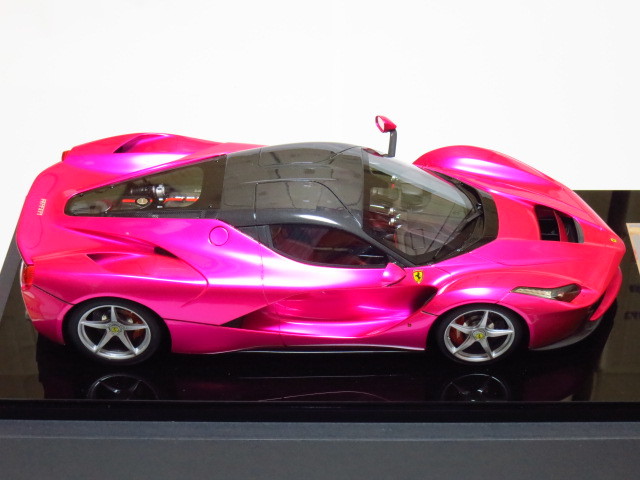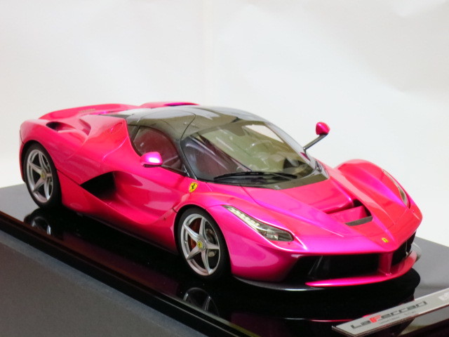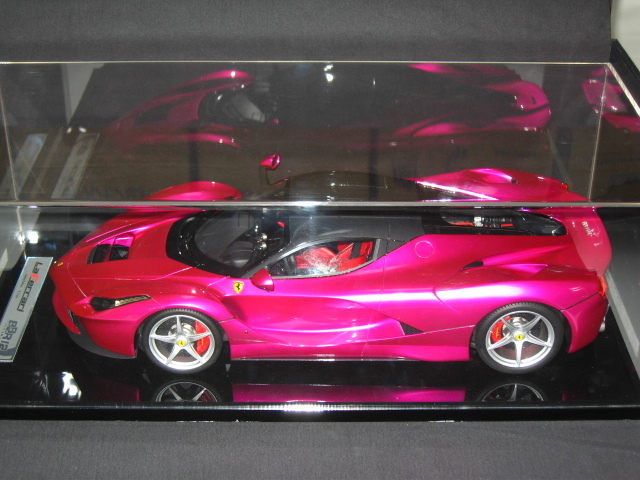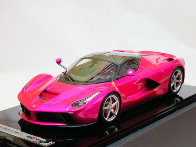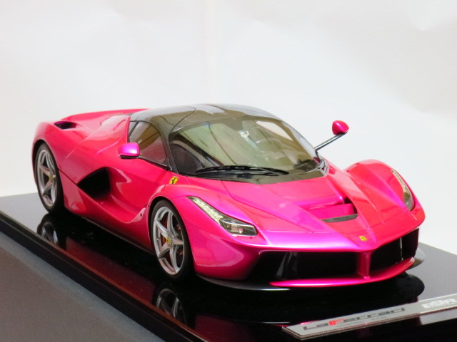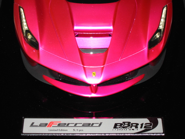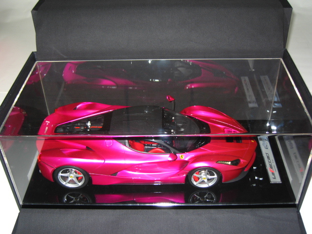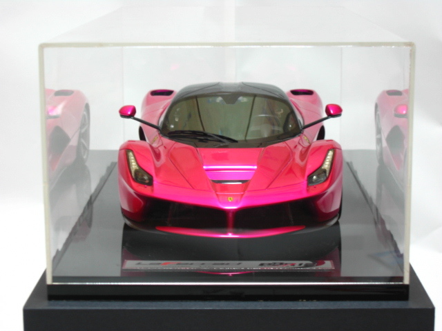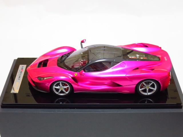★。今回お譲りさせて頂きます写真掲載中のモデルカーは、世界的にも非常に人気が高く新品定価も超高額な 『 フラッシュ・ピンク 』 で塗装された BBR製  1/12  ” ラ・フェラーリ ” です。” La Ferrari ” で ( Flash Pink ) でしかも 『 世界限定 5台 』  と言う事もあり発売されるや即完売になった超入手困難な超人気モデルです。今回お譲りさせて頂きます 『 BBR製 1/12 ” ラ・フェラーリ ” 』 の フラッシュ・ピンク は、ボディカラー ( フラッシュ・ピンク ) 、シート ( 赤 )、ブレーキ・キャリパー ( 赤 )、ホイール ( シルバー )、ルーフ ( カーボン・ルーフ ) 仕様となります。リアには、作り込まれた 12気筒エンジンを鑑賞可能です。本モデルカーは、1/12 スケールと言う事もあり実物はかなり大きく重量があります。重さに関しましては ( モデルカー本体 + 台座 = 15 キロ以上 ) ありますので、かなりズッシリとした高級感があります。今回お譲りさせて頂きます写真掲載中のモデルカーは、モデル本体の悪い症例  『 ウィンドウ各部の浮きやハガレ 』  なども一切ない最高のモデル ( 個体 ) です。新品購入時の外箱も、3重箱で保護されており、新品時の状態を今現在でも見事にキープしておりますが、クリアケースを装着した状態で展示歴がありますので中古品として出品させて頂きます。新品時の付属品はすべて揃っておりますのでどうかご安心ください。今回お譲りさせて頂きます写真掲載中のモデルカーは、当方が購入しました金額よりお安く 『 赤字 』 にて出品させて頂いております。それでいて シリアルNo,『 05/05 』 という通常では入手が不可能な世界中でも引っ張りダコの超人気シリアルNo,を併せ持ったモデル ( 個体 ) となります。本モデルカーは自分用のコレクションとして購入時より今現在まで大事に暗所保管しておりましたが今回、赤字にて出品する事にいたしました。ご興味のある方は、お買い得だと断言いたします!