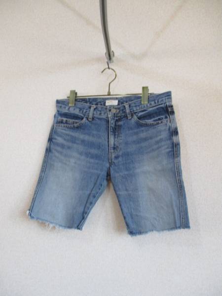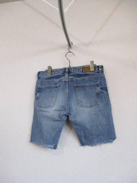 | 商品紹介 | デニムのハーフパンツです。 部分的にスレや破れのダメージ加工が施されています。 裾は切りっ放しです。(もとはフルレングスのデニムでしたが当方で切っています。) 《素材》 綿100% |