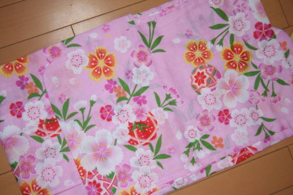 ピンク地に桜と撫子のお花と可愛い毬柄をとりいれた女の子らしくってとっても可愛い浴衣です。