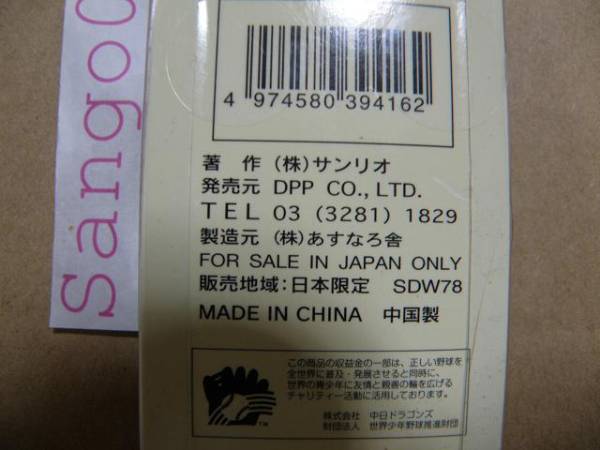 *『ハローキティ ショートストラップピッチャー 中日ドラゴンズサンリオ』のご案内です。販売地域日本限定で、現在は入手困難なお品です。 *商品の説明:ピッチャーの格好をしたキティちゃんです。ヒモには青い星の形と透明な玉のビーズが交互に連なっています。カバンのファスナー、PHSや携帯に取り付けることが出来ます。 ■品名:ハローキティ ショートストラップピッチャー 中日ドラゴンズ ■キティちゃんの大きさ:約2.4cm(金具含まず。) ■材質:部分的に塩化ビニル樹脂(非フタル酸可塑剤使用)を使用しています。 ■ヒモの長さ:約7.5cm ■重さ:約15g(ケースごとすべて含む。) ■著作:株式会社サンリオ ■発売元:DPP CO.,LTD. ■製造元:(株)あすなろ舎 ■販売地域:日本限定 ■生産国:中国製 ■定価:810円(税込) *正確な製造年がわかりませんが、台紙に1976,2006と記載されているので、おそらく2006年の製造だと思われます。(中央画像を参照下さい。) *画像と実際の商品の色合いは、多少違うかも知れません。またサイズは全て自宅で測りました。多少の誤差はご了承下さい。画像盗用防止の為、IDラベルが写っていますが、商品には付きませんので、ご安心下さい。 ★商品の状態は新品ですが、台紙に折れ、スレ、黄ばみ等があります。自宅保管で年月が経過していますので、神経質な方の入札はご遠慮下さい。★ ★送料はこちらで負担致します。『ゆうパケット(おてがる版)』を予定しています。保証はありませんが、追跡出来ます。それ以外の発送は別途料金頂きます。 ヤフーの『はこBOON』は、取り扱っていません。 その他の追跡や保障のある発送方法はご相談下さい。家の近くには、ゆうちょ銀行とヤマト運輸があります。★ ★万一届かなくても、責任は負いかねますので、以下の方は、クリックポスト便や定形外郵便、レターパックライト等、手渡しではない郵便物の発送はご遠慮下さい。 ・カギがないポスト。 ・封筒等はみ出してしまう小さなポスト。 ・留守がちで郵便物が一杯になってしまうポスト。 ・マンション等の集合ポストで、繋がっている簡易ポスト。 ・あて先名と表札名が異なるポスト。 ・住所、表札が出ていないポスト。 ・配達人がよく誤送するポスト。 上記の方は、ヤマト便やゆうパック、レターパックプラス等の配達人からの直接手渡しをお勧め致します。★ ・原則として、入札後・落札後のキャンセルは受付けませんので、ご了承下さい。 ・評価に不安のある方の入札は、こちらの判断により、取り消しさせて頂きます。 ・追跡・保証のない発送は致しません。 ・振込み手数料はご負担ください。 ・手渡し取引は致しません。 ・落札後は、終始取引ナビにてお願い致します。(メール不可) ・落札後のトラブル回避の為にも、気になる点はご質問下さい。 | |||