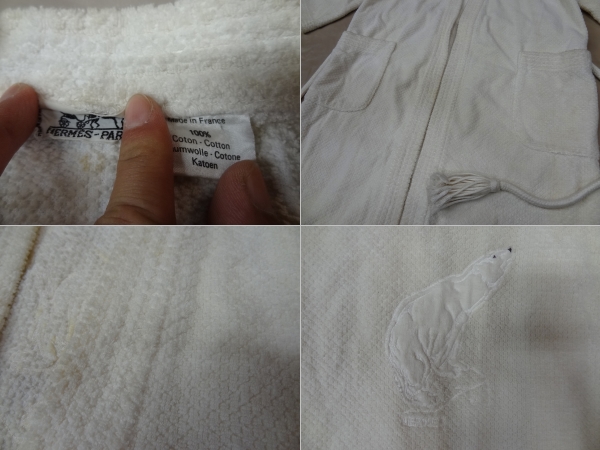 HERMES エルメス フランス製 希少 ホワイト パイル地 コットン ワッフル バスローブ ガウン コート ラウンジ リビング 白 ロング ガウン