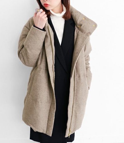 少し傾斜がついた前のファスナーは閉めた時の防寒はもちろん開けて着るとスタンドカラーにボリュームがでるので首周りを優しく包み込み女性らしい印象に◎