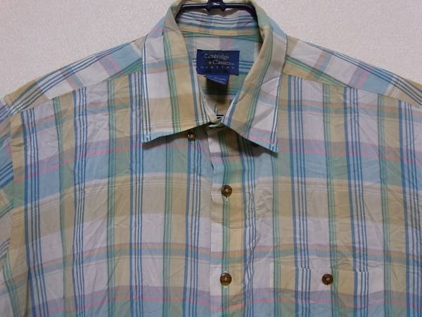 即決!USA古着●Cambridge Classicsチェックデザイン半袖シャツL!アメカジ・ビンテージ!アメリカで買ってきましたユーズドの鮮やかなチェックデザイン半袖シャツです。カラーは写真を参考にして下さい。表記サイズLで、着丈(後ろ)約74.5cm、身幅約60.5cmです。素人採寸ですので多少の誤差はご了承お願い致します。状態は古着ですので、ある程度の着用感あります。特別目立つキズ、よごれはありませんが、あくまで古着として考えてください。古着にご理解のある方の入札お願いします。定型外郵便、レターパックまたは、ゆうパック着払いでの発送になります。他にもいろいろ出品しています。よろしくお願いします。
