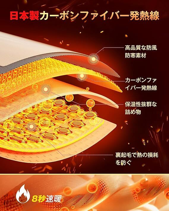 日本製カーボンファイバー発熱線を採用し、スイッチを入れてわずか8秒で温まり始めます。