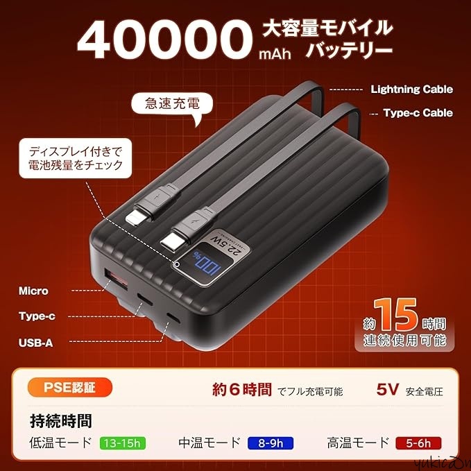 ・バッテリー容量:40000mAh(最大約15時間連続使用)