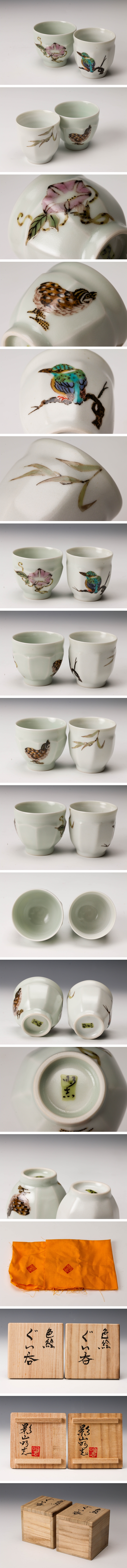 【佳香】影山明志 色絵ぐい呑(柳に翡翠、鶉と朝顔) 二客セット 共箱 共布 本物保証