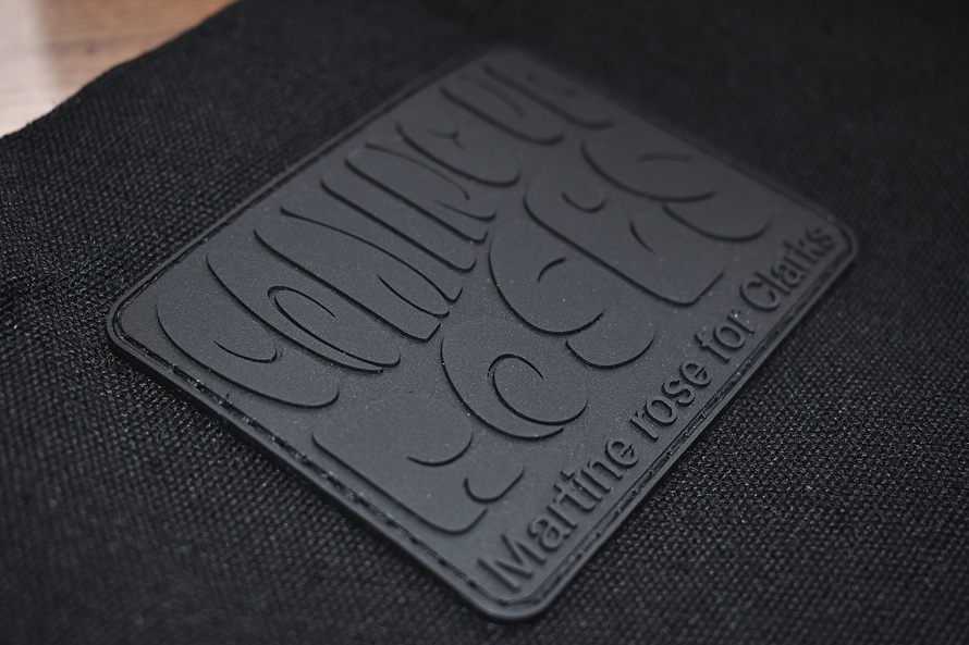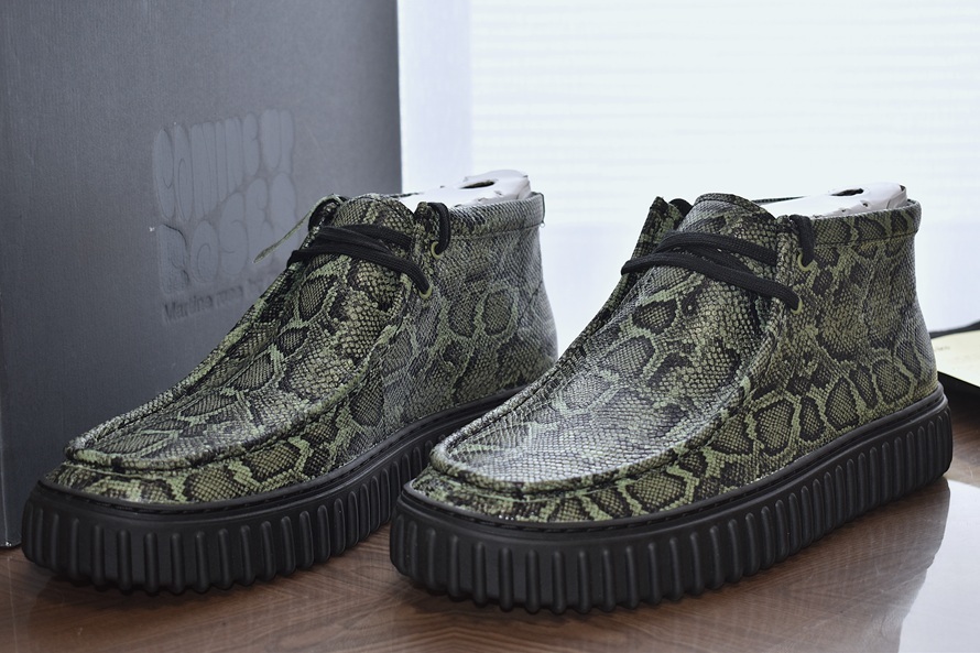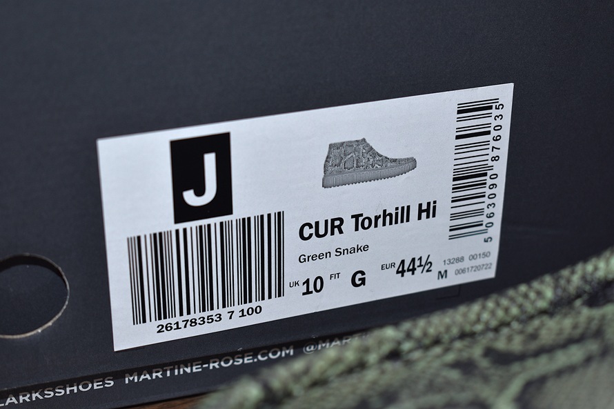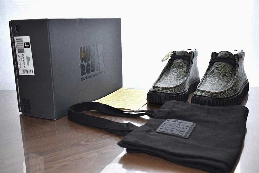 ロンドンの多文化的な背景や音楽からインスピレーションを得て、ユニークで斬新なアプローチを取りいれた、ストリートとラグジュアリーを融合させたコレクションを発信する英国デザイナー【マーティンローズ】と、クラークスが行なったコラボアイテムの一つで【Torhill Hi】と言うモデル名のワラビーモデファイシューズです。