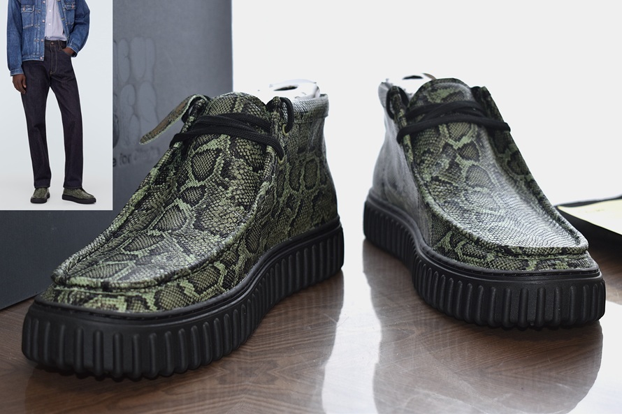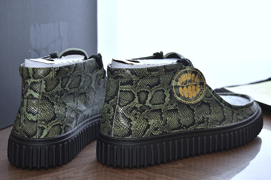 CLARKS × MARTINE ROSE クラークス × マーティンローズ Torhill Hi Green Snake トーヒルハイ グリーンスネーク ワラビーモデファイ パイソン型押しレザー ショートブーツ / レースアップシューズ【グリーン系/サイズUK10(日本サイズ29cm相当】です。
