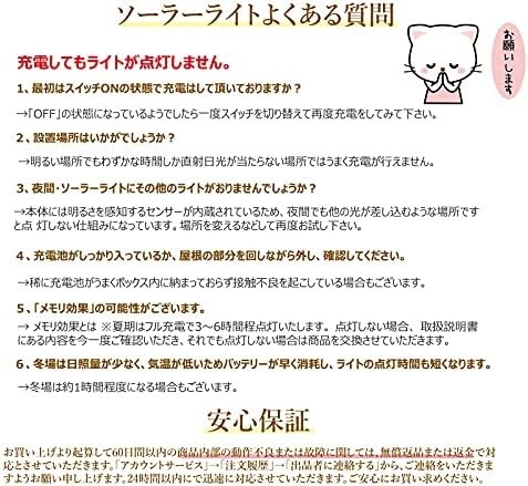 【自動点灯・手間いらず】 照度センサーを内蔵しているので、スイッチトグルNO, 暗くなるとLEDライトが自動で点灯、明るくなると消灯します。ソーラー充電するのでスイッチを入れる。《ご使用になる前に》スイッチONの状態で、直射日光の当たる場所に8時間程度置き、十分に充電してからお使いください。《点灯について》室内や明るい場所で点灯させる場合は、パネル部分を覆って光を遮断してください。
