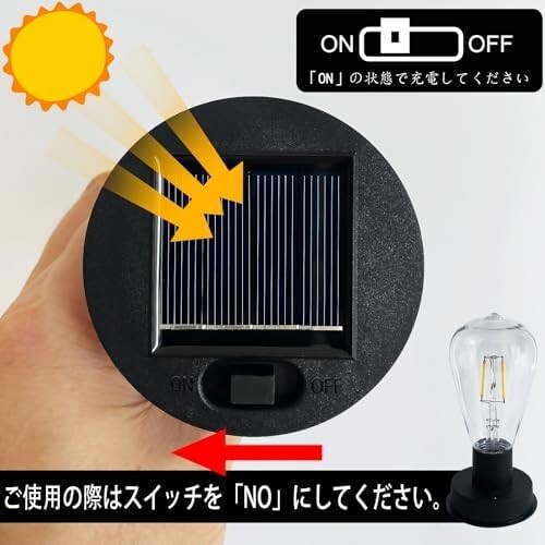 • 【正しくお使いください】 OFFは全閉です。ご使用の際はスイッチを「NO」の位置にしてご使用ください。暗くなると自動で点灯し、電池がなくなると消灯します。充電する際も「ON」の状態で充電してください。スイッチを入れて「NO」の位置にしてください。暗い場所で点灯しない場合は、「ON」の状態にして太陽光に当てて充電してください。バッテリーが完全に充電された後は、通常どおり使用できます。