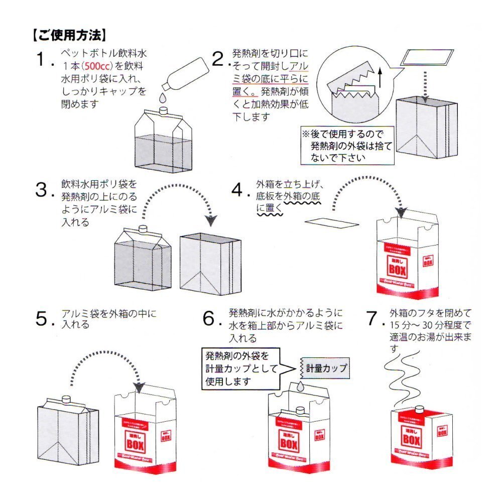 | 火や電気がなくてもあたたかい食事が食べられます モーリアンヒートパックは少量の水があれば加熱できます。 加熱袋の中に、発熱剤をセットし、温めたい食材等を発熱剤の上に置いて、水を入れるだけです。 従来の生石灰を用いた発熱剤と違い、 温度コントロールに優れており、安定した持続的なエネルギーで飲食物を加熱します。 使用する水は水道水や井戸水、ミネラルウォーターはもちろん、川や池の水、雨水でもOKです。 (ただし、海水は使用できません) 非常時やアウトドアなど、電気や火を調達しにくい場所でも、 温かな食事を召し上がっていただくことができます。