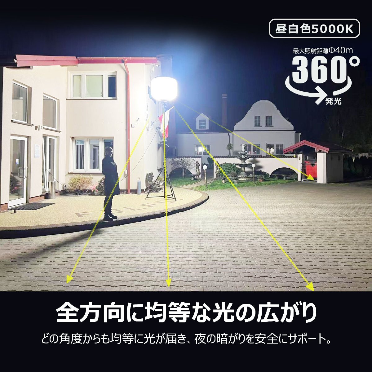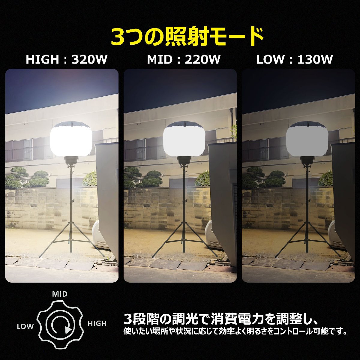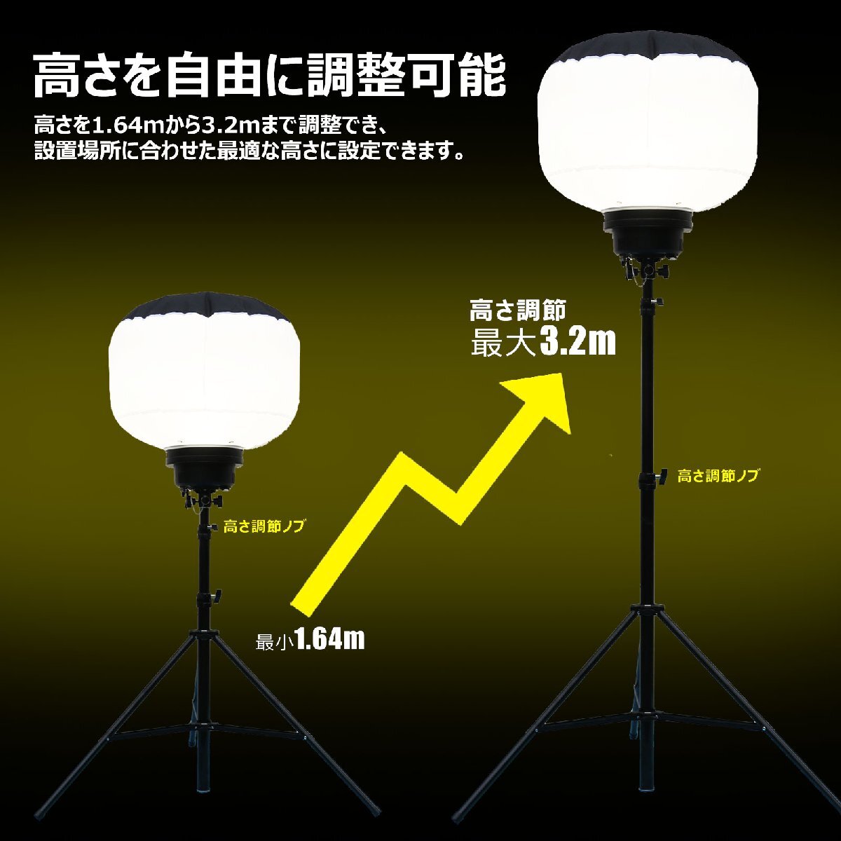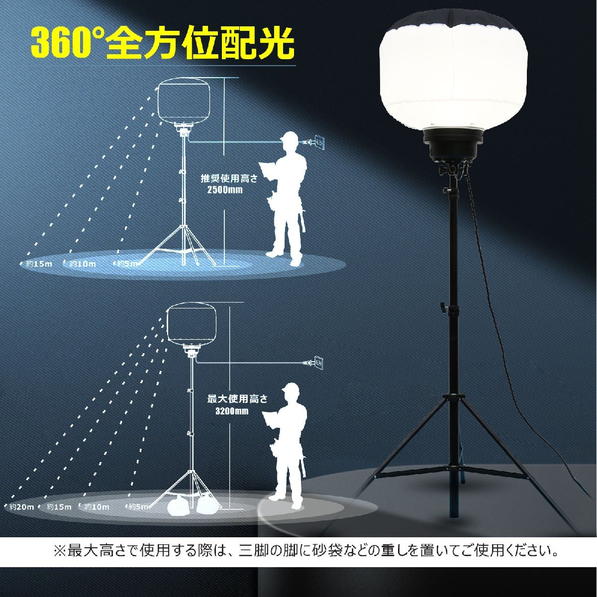 ![]() ![]() ![]() ![]() ![]() ![]() ★オススメポイント★ 360°配光 防眩効果のあるバルーンで360°眩しくなく明るく照らせます 防虫フィルター フィルターが空気中のホコリや虫などをキャッチし中に入り込んでしまうことを防いでくれます。 【実用新案権取得】 調光モード 3つの明るさモードを搭載!場面によって適切な光量を選べます。 三脚スタンド 高さを1.64m~3.2mまで自由に調整可能! 電源スイッチ 電源スイッチ付きなので、使わない間は消灯にして省エネ! 防水等級IP65 雨の日など屋外でも使用できるIP65等級!