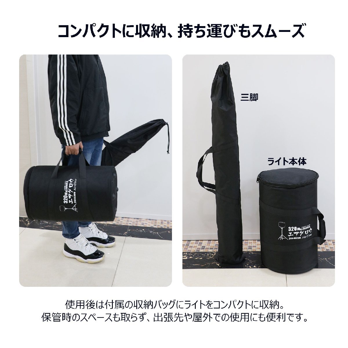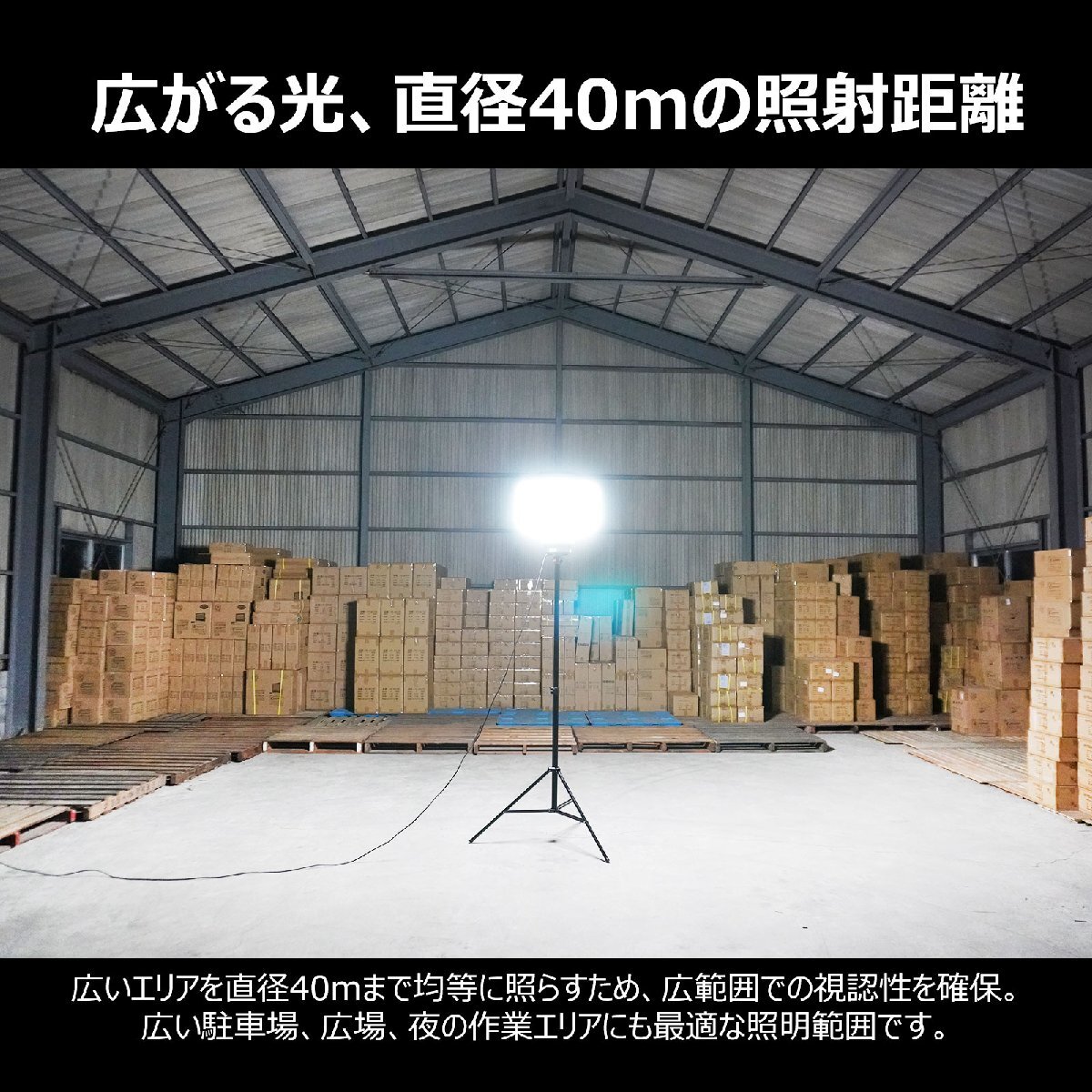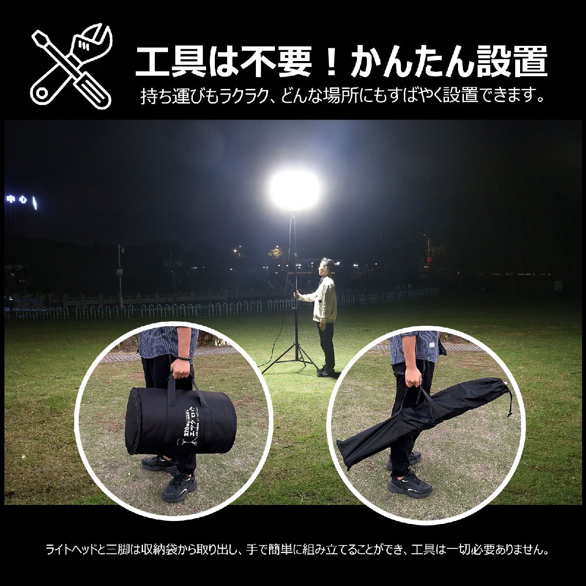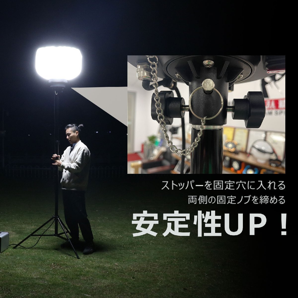 ![]() ![]() ![]() ![]() ![]() ![]() ★オススメポイント★ 360°配光 防眩効果のあるバルーンで360°眩しくなく明るく照らせます 防虫フィルター フィルターが空気中のホコリや虫などをキャッチし中に入り込んでしまうことを防いでくれます。 【実用新案権取得】 調光モード 3つの明るさモードを搭載!場面によって適切な光量を選べます。 三脚スタンド 高さを1.64m~3.2mまで自由に調整可能! 電源スイッチ 電源スイッチ付きなので、使わない間は消灯にして省エネ! 防水等級IP65 雨の日など屋外でも使用できるIP65等級!
