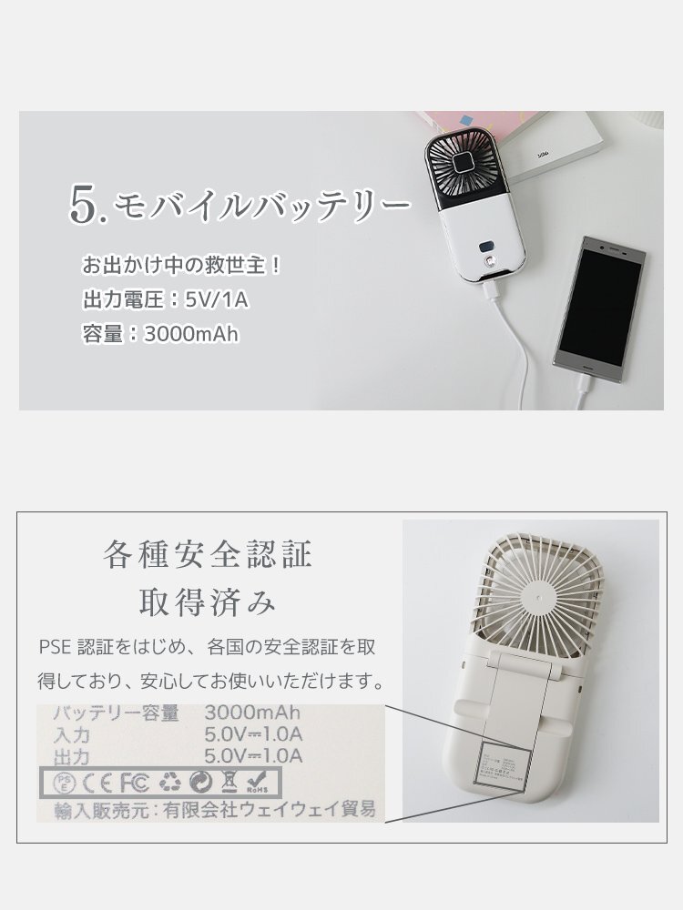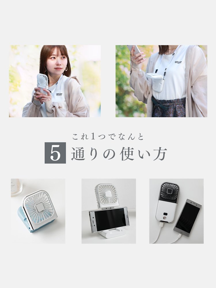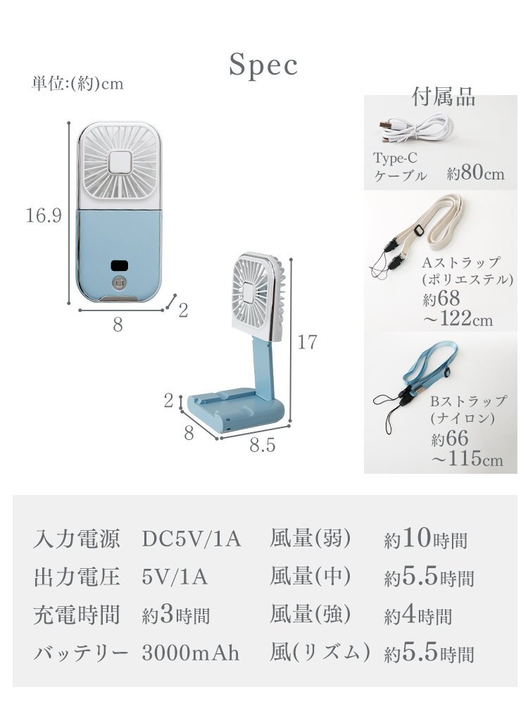 多機能5way!手持ち、首掛け、卓上として何処でも使えます! 長さ調整可能なネックストラップ付き♪ 自由に好きな角度に調節可能! ボタン1つで簡単に4段階の風量調整ができます。 その他、スマホスタンド・モバイルバッテリーとしてもご使用いただけます♪ 【商品仕様】 カラー:スモーキーブルー Aタイプストラップ サイズ:(約)横8×縦16.9×厚さ2cm 重さ:(約)130g 充電時間:(約)3時間 バッテリー:3000mAh 付属品:Type-Cケーブル、ネックストラップ 【注意事項】 ・本製品は電気用品安全法の認証を受けたPSE技術基準適合品です。 モバイルバッテリーとしてご使用になる際、使用しても良い機種か予めご確認ください。 使用中の破損や事故などにつきましては責任を負いかねます。 ・入力と出力を逆に接続しないでください。故障・発熱・発火・破裂の原因となります。 ・輸入品の為、輸送の際に生じるキズ、箱潰れ、汚れなどがある場合がございます。 ・サイズ、重量は、多少の誤差が生じる場合がございます。 ・高温になる場所、火、ホコリ、霧、油煙が発生する場所の近くで使用しないでください。 ・商品は、モニターによって色合いが異なって見える場合があります。 ・仕様・デザインは改良のため予告なく変更することがあります。 |