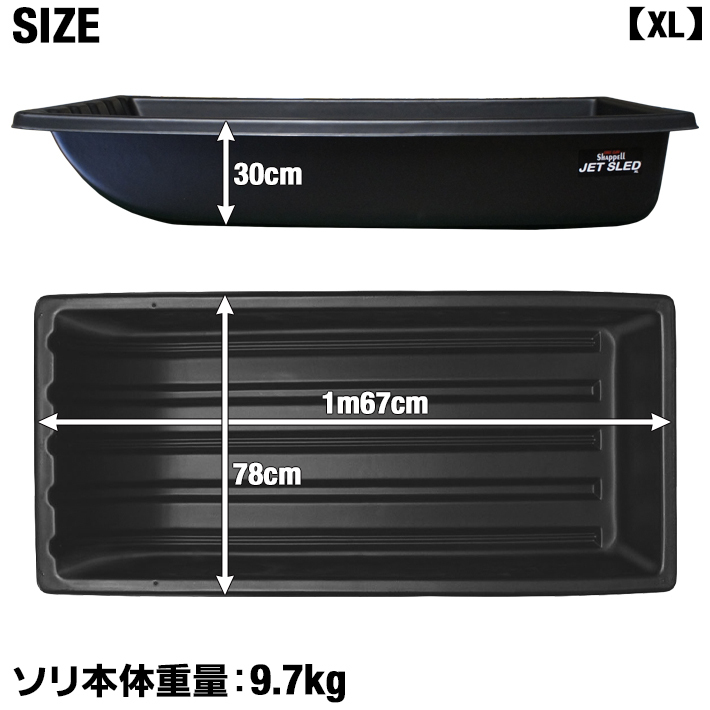 現在日本で多く流通しているプラスチック製のソリは色鮮やかで、人が乗って遊ぶ事が前提の形状の物がほとんどですが、厳しい冬山での実用的な目的で開発されたJET SLEDはブラック、カモフラージュ、ウィンターカモ、ブレイズオレンジの4色、実用品としての重厚な印象の色もさることながら、大型、肉厚で深さのある本体は、重量物を楽に移動する為の強度と安全性が考慮された、まさに道具としての堅牢なデザイン、スキー場などのウィンターレジャー施設、アウトドアシーンでは今までに無いソリとしてとても目を引きます。