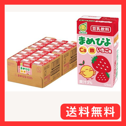 「マルサンアイ まめぴよ いちご味 125ml 24本」▼4901033005429▼(商品説明)「マルサンアイ まめぴよ いちご味 125ml 24本」▼4901030000000▼(商品説明)-/120ミリリットル (x 24)/-・FlavorName:いちご・パッケージ個数:1・原材料:大豆(カナダ)(遺伝子組換えでない)、糖類(ぶどう糖果糖液糖、砂糖)、いちご果汁、イソマルトオリゴ糖含有シロップ、植物油脂、ドロマイト、食塩、乾燥パン酵母/トレハロース、安定剤(増粘多糖類)、香料、リン酸三カルシウム、pH調整剤、乳化剤、ピロリン酸第二鉄・商品サイズ(高さx奥行x幅):9cm×16cm×29cm大豆に含まれる植物たんぱく質はバランスが良く、お子様の成長サポートに最適です。まめぴよは1本(125m)lでCa100mg、Fe0.9mgを含み、さらに体内で合成することのできない必須アミノ酸9種類をバランス良く含んでいます。乳成分不使用ですのでアレルギーのお子様も活用いただけます。飲みやすいいちご味。おやつにどうぞ。