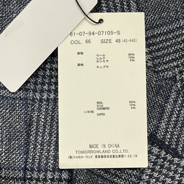 新品 75900円 TOMORROWLAND 2Bジャケット トゥモローランド  PILGRIM ピルグリム ロロピアーナ イタリア ファブリック 三者混 YL2526 テーラードジャケット チェック ウール シルク カシミヤ ハイクオリティー 秋 冬 しっかりしてソフトな上質素材