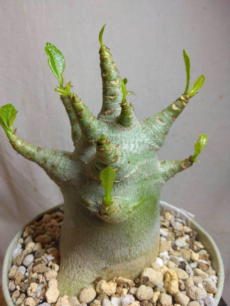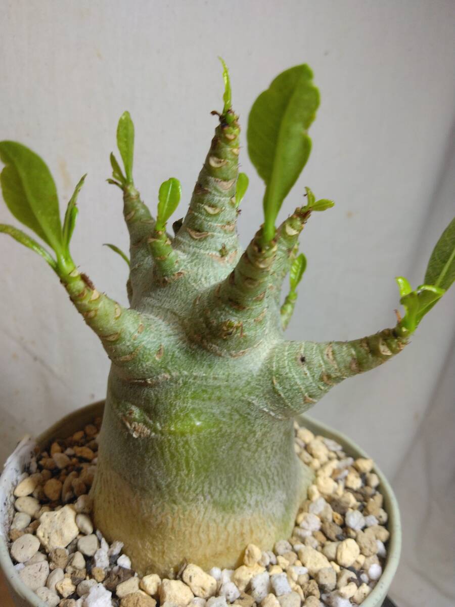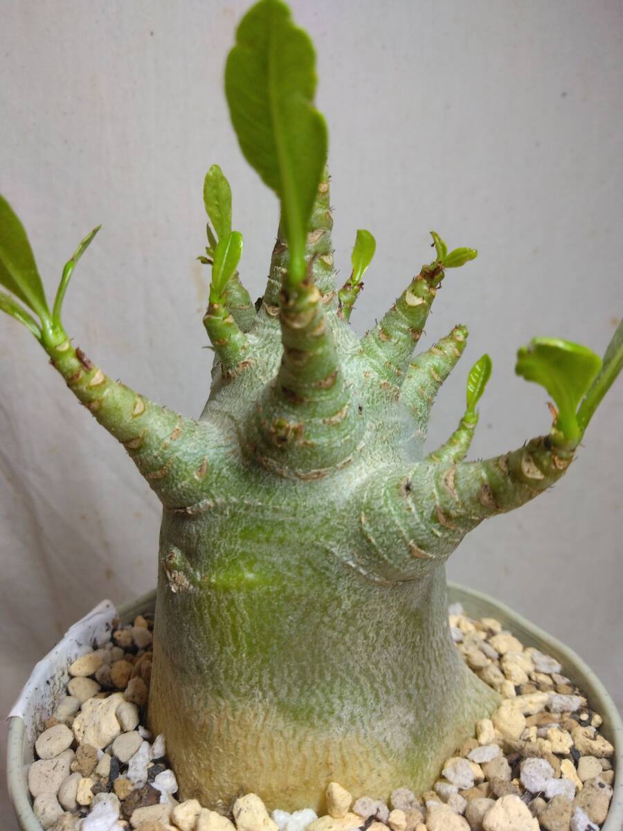 到着しましたらパキポより保湿性のある用土に植える事をお勧めします、 思ったよりも水が好きです。育成環境にもよりますが小苗ですと1カ月ほどで葉っぱが出ます。大苗の場合はもう少し時間がかかります。ドワーフという名前の通り、上に大きくなるタイプではありませんので、盆栽のように仕立てて楽しむこともできます。