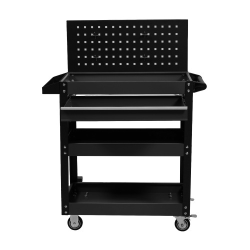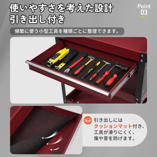 ◎01 【収納力抜群のツールワゴン】小さくても収納力は抜群!限られたスペースでも、工具をしっかり整理でき、作業効率が大幅にアップします。◎02 【フック付き有孔ボード】両側とトップに有孔ボードを配置し、コンパクトながら収納力抜群。スペースを効率よく活用できます。【4個のフック付き】工具や小物を簡単に整理でき、作業効率が向上します。◎03 【安心の天板設計】天板には約5.5cmの縁付きガードを設置し、工具が転がり落ちる心配がありません。◎04 【使いやすさを考えた設計】【引き出し付き】頻繁に使う小型工具を種類ごとに整理できます。引き出しにはクッションマットがついており、工具が滑りにくく、傷や音を防げます。【引き出しの取り外し方】両側のレバーを同時に押すと、引き出しが簡単に取り外せます。◎05【スムーズな移動】360度回転キャスター付きで、簡単に移動できます。【サイドハンドル】【4輪の自在キャスター】【2輪ストッパー付き】【便利なサイドトレー】ネジやドライバーなどを仮置きできるサイドトレーで、作業中も便利です。