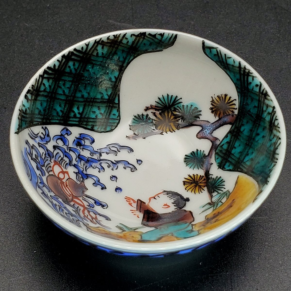 【宝蔵】九谷焼 浅蔵五十吉 色絵唐子遊 酒盃 口径約6㎝ 酒器 共箱