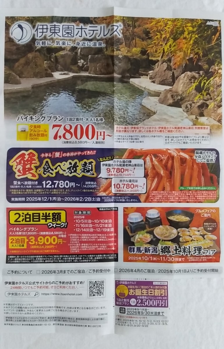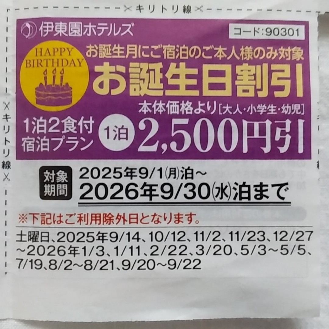 伊東園ホテルズのお誕生日割引券です。有効期間は2026年9月30日までです。はなの金曜日割引券は使用済みです。