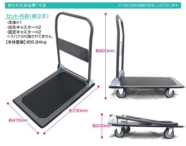 | 業務用としてはもちろん、家庭に一台あれば、重い荷物の運搬時に活躍します! アウトドアやレジャーに台車を持っていくと便利です! 野外では食材や食器、BBQ道具の運搬に活躍すること間違いなしです! また倉庫内作業、ゴミ出しも台車があればスムーズに行えます♪ 折り畳んだときの厚みはなんと約23cm! 邪魔になりにくく、玄関や車などの限られたスペースにスッキリ収まるコンパクトな台車です! ■商品コード:AT059A ■商品仕様 耐荷重(約):150kg サイズ(約):幅470×奥行730×高さ820mm 折りたたみ時サイズ(約):幅470×奥行730×高さ230mm 重量(約):7kg 素材:スチール ■注意事項 ・こちらの商品は組立商品となります。 (車輪をつけるだけです。設置作業はどなたでも簡単に組み立てできます) ・箱がつぶれている場合もございますが商品に問題はありません。 ・海外製品で簡易梱包での輸入のため風防に擦れや多少の小キズなどがある場合がございますが、 商品自体には問題ありませんのでご了承下さい。 ・仕様・デザインは改良のため予告なく変更することがあります ■保障期間 7日間 ※商品到着後7日以内の初期不良・破損のみご対応させていただきます。 【新品未使用品です】 |