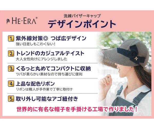 | 内 容 | ■ヘ・エラ はっ水・UVカット あごひも付大人女性に提案する! 洗練バイザーキャップ ■サイズ ・対応内周:約56~58cm ・つばの長さ(最大幅):約10.5cm ■素材 ・表地:綿75%、ナイロン25% ・リボン部分:レーヨン100% ・裏地:ポリエステル100% ■詳細 ・サイズ調節可 ■付属品 ・あご紐 ■カラー スモーキー ◆参考価格 8140円相当 大人女性のためにデザインされたキャップです。 幅広いつばと横に折りたたまれた配色のリボンが デザインポイントとなっており、つばは折り上げることも可能。 つば部分には、紫外線遮蔽率99%以上、UPF50+のUVカット性と、 近赤外線遮蔽率96%以上(測定波長:780~2600nm)の機能を 搭載しました。 裏地には、抗菌防臭加工がほどこされた通気性の良いメッシュ素材を採用。 あごひもは取り外しが可能で長さ調節もできるため、 風の強い日や自転車に乗る時にも重宝します。 雨などで濡れてもお手入れしやすい、はっ水機能付き。 持ち運びにも便利な軽量仕様で、 つばが柔らかいのでコンパクトに丸められるのもポイントです。 |
