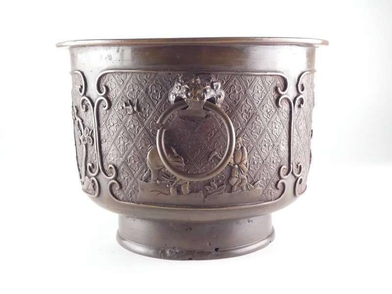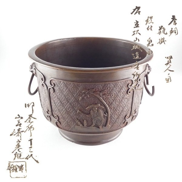 【都屋】十三代 宮崎寒雉「唐銅 賢人ノ図 瓶掛」茶道具 共箱 幅 約23cm 1023 R141