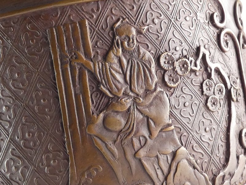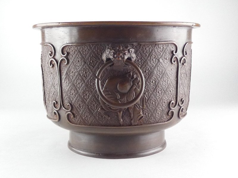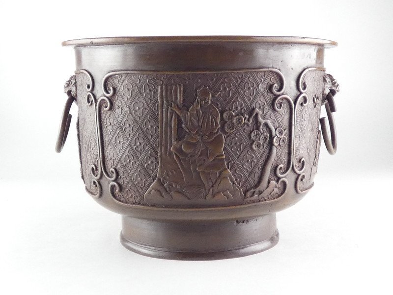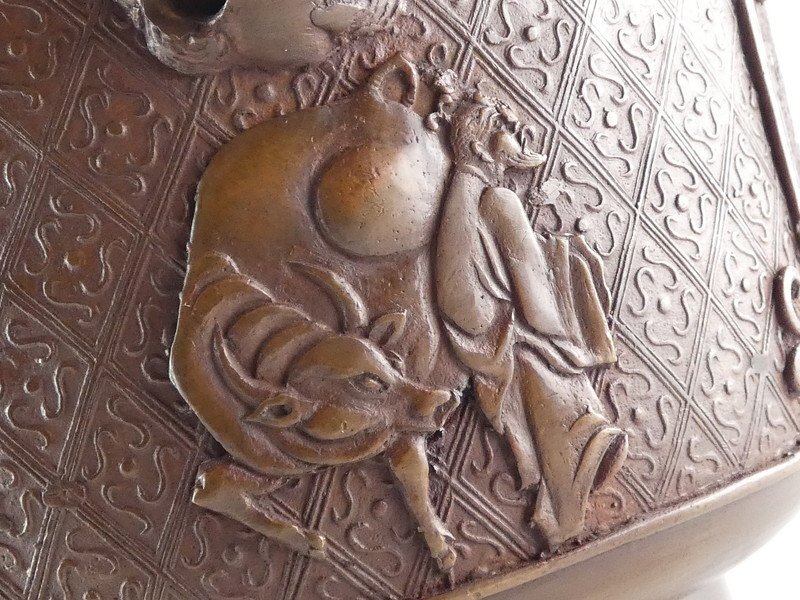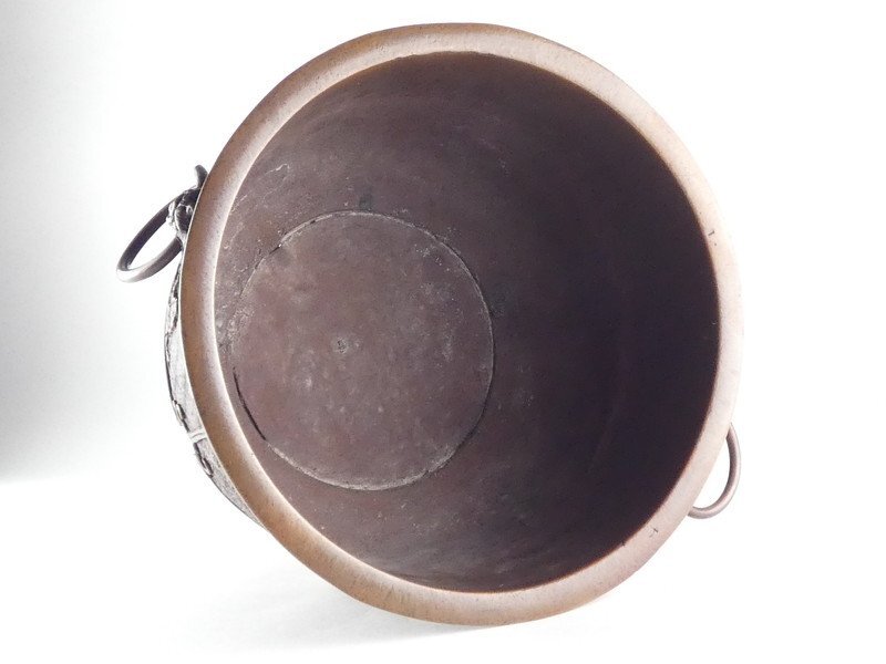 十三代 宮崎寒雉「唐銅 賢人ノ図 瓶掛」茶道具 共箱 幅 約23cm 茶釜