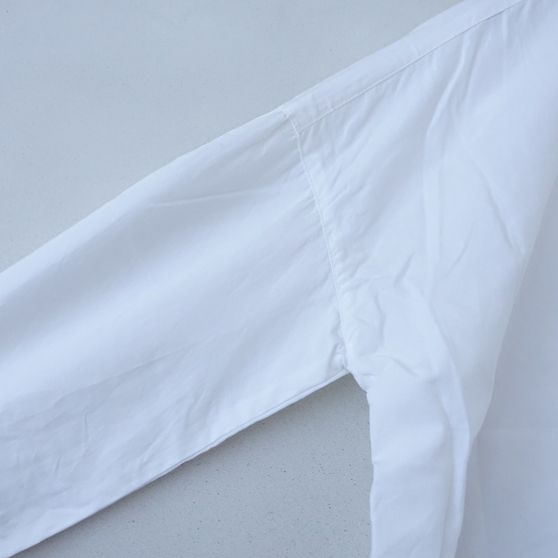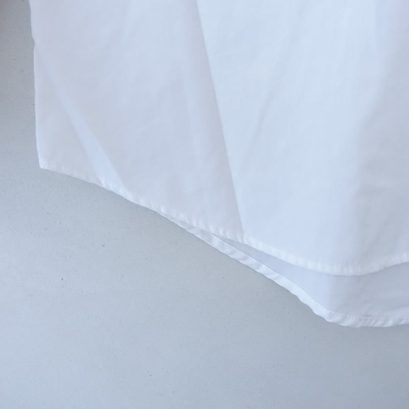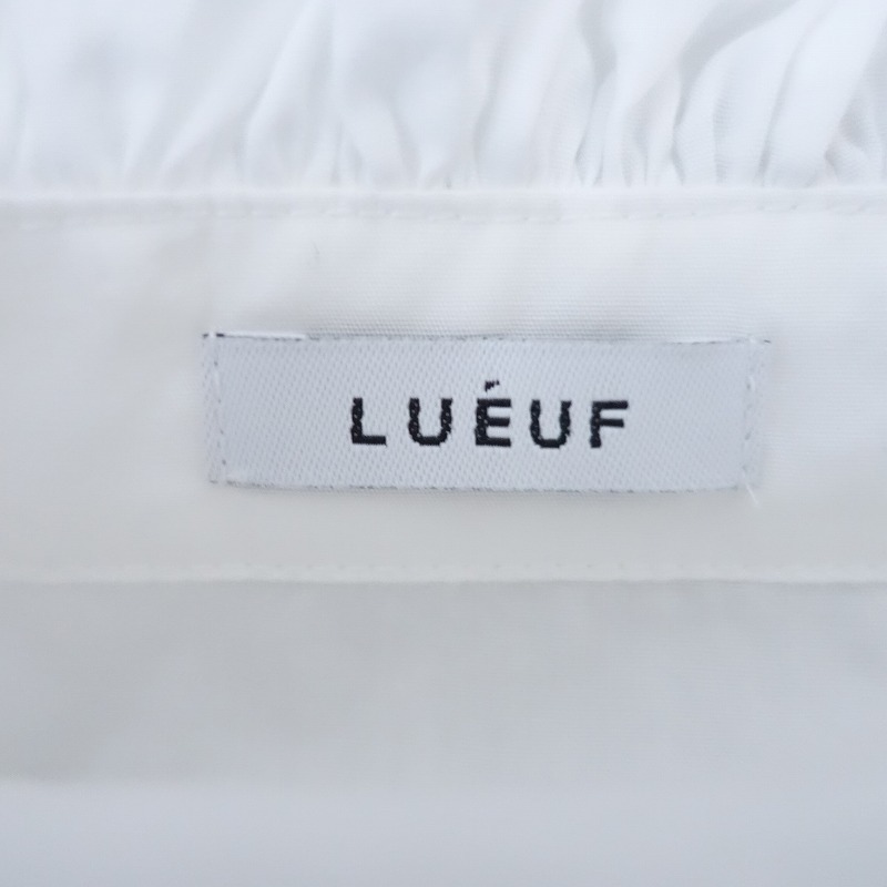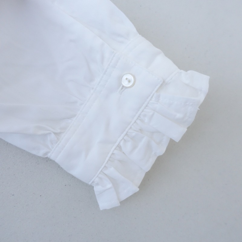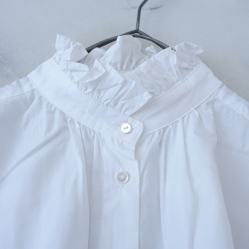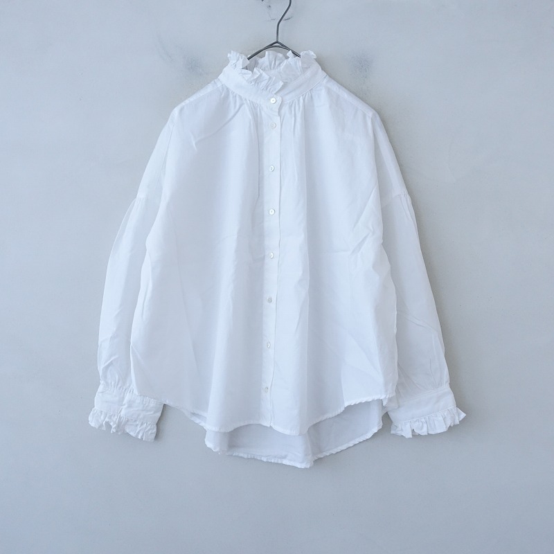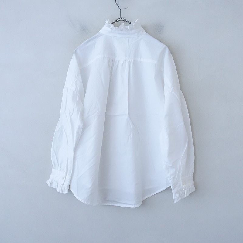 | LUEUFのコットンフリルブラウスです。カラーはホワイトで、布帛地です。ネック&袖口に共布フリル付きで、ネック周り&背上部&袖にギャザーが施されております。フロント&袖口ボタンで着脱でき、裾はラウンドカット仕様で、後ろ裾丈が少し長めです。 |
