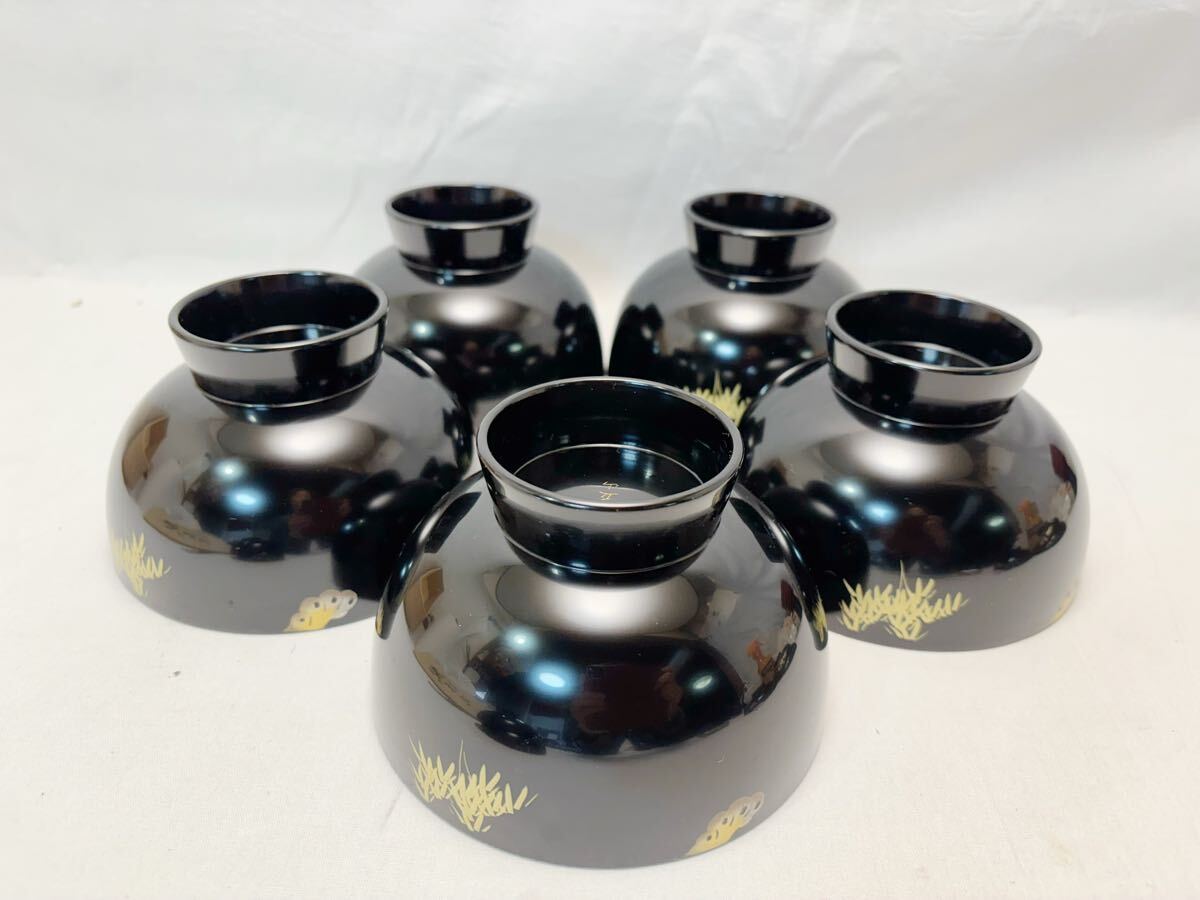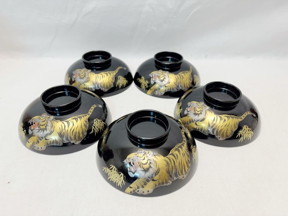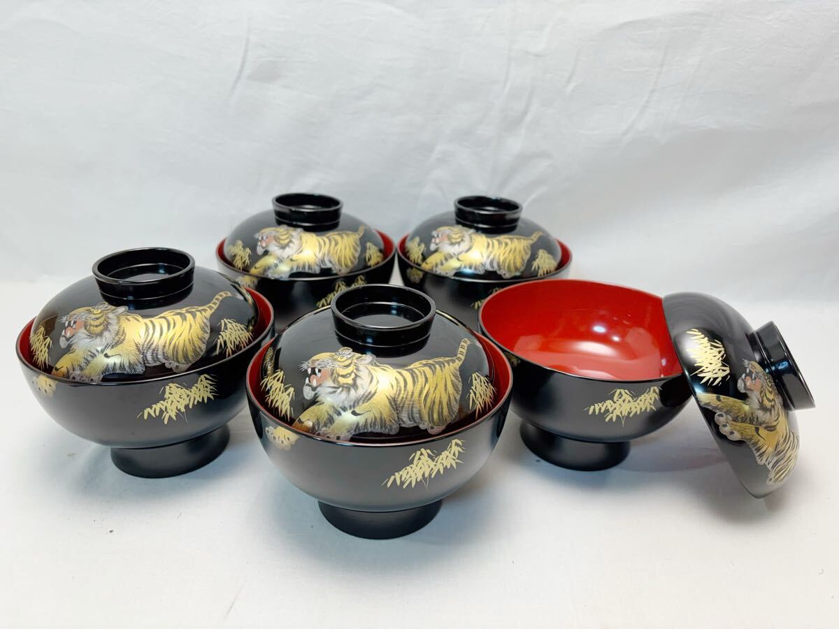 懐石道具 冨田立山作 天然木製 黒真塗 寅彫漆 雑煮椀 5客揃え でございます。