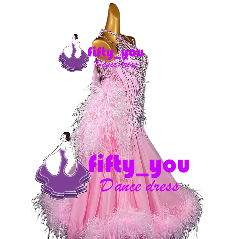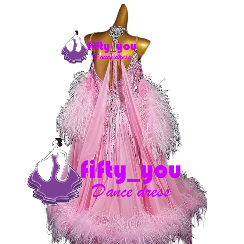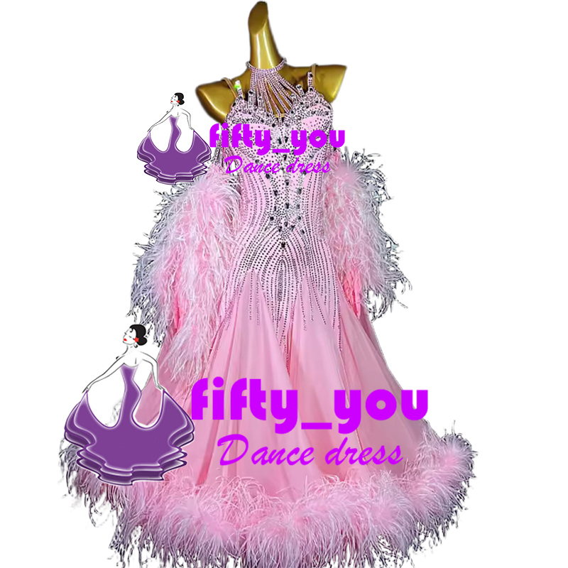 新品fifty_you レディース社交ダンスドレス  モダン競技ドレス セミオーダー スタンダードドレス  ボリュームファー付き ピンク
