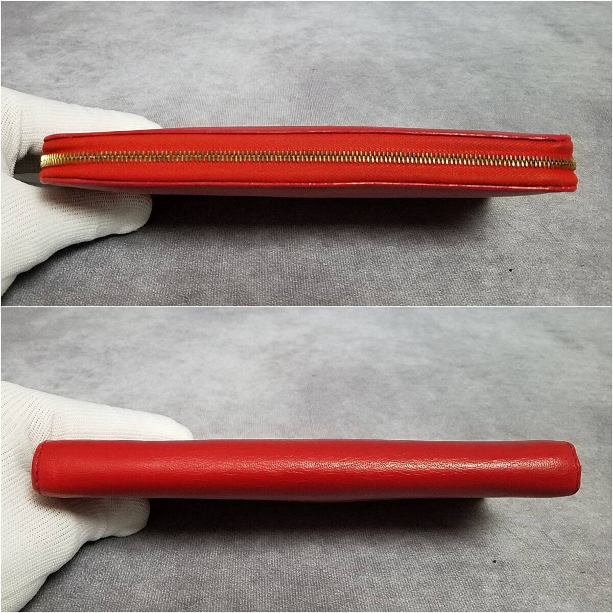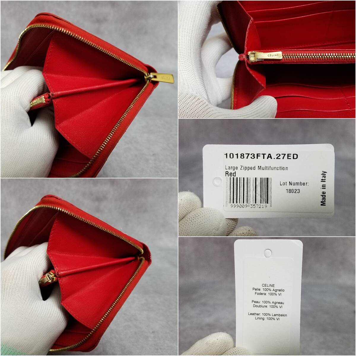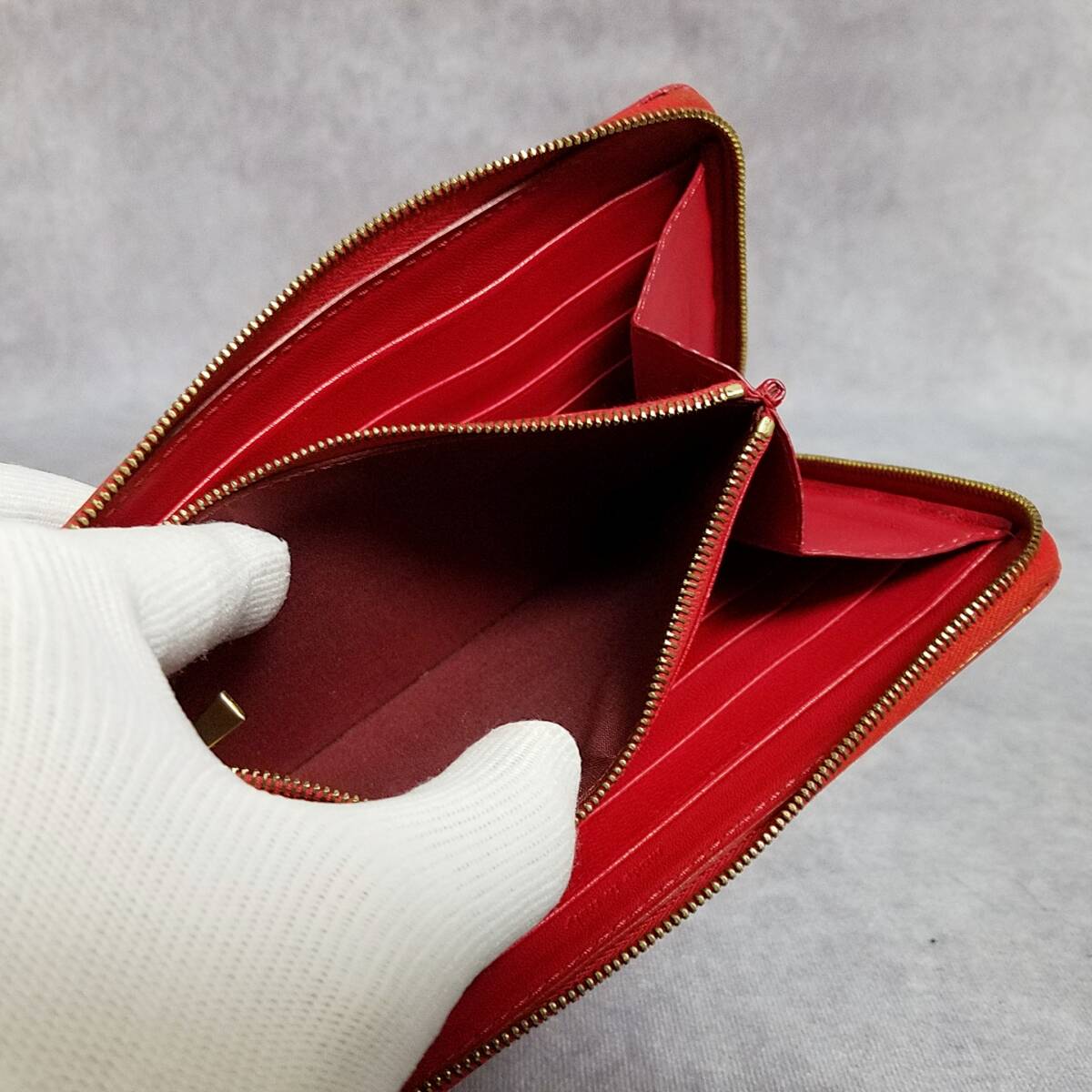 ・カーフスキンのライニング、ゴールドフィニッシュ、ジップクロージャー、ジップ付きコインポケットX1、クレジットカード用スロットX12、ガセットコンパートメントX2、フラットポケット X 2