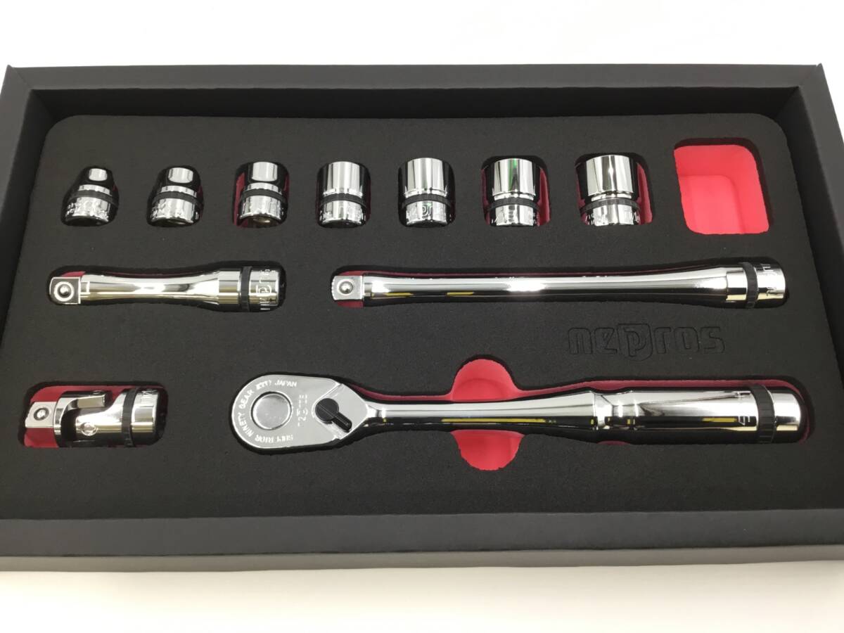 | 機能特徴 | 差込角(sq.):9.5 ソケット内容:(六角)5/16、3/8、7/16、1/2、9/16、5/8、11/16 ハンドル内容:ラチェットハンドル(NBR390A)、エクステンションバー(NBE3-075:75mm、NBE3-150:150mm)、ユニバーサルジョイント(NBJ3) セット内容(点):11 |